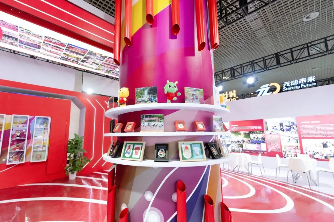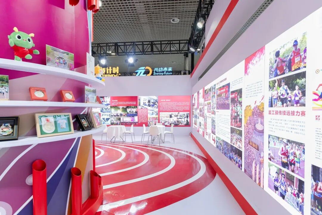 展区精心布置校园马拉松体育文化展示墙,各类赛事特色周边以及影音资料与宣传手册,多元化、多角度展现了学校历届赛事中的精彩瞬间和校园体育文化的丰富内涵与独特风采,以及我校在推动高端赛事与大众运动深度融合方面的大学体育实践成果。