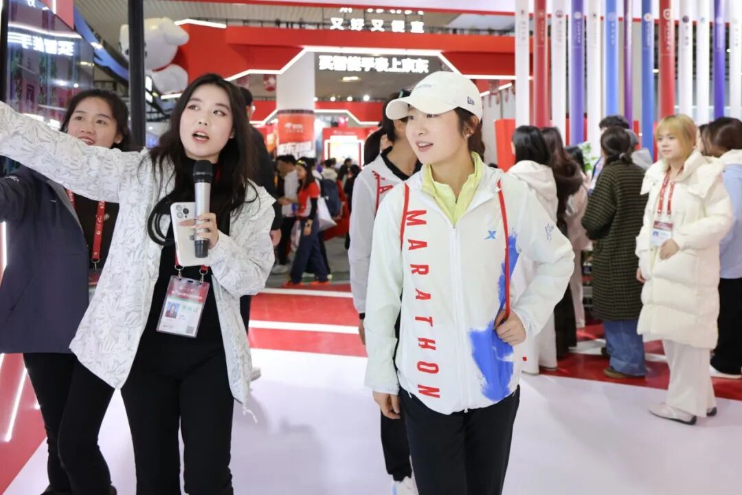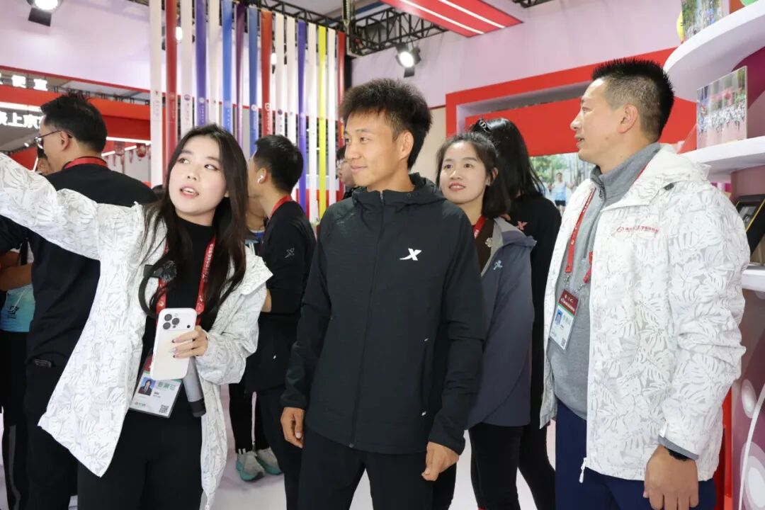 中国马拉松冠军跑者何杰、徐冰洁、黄菲也来到我校展位参观交流,并对学校浓厚的体育氛围与办赛成果给予了充分肯定。