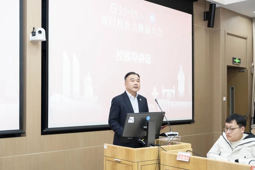 李雄虎副董事长、执行校长、校友总会会长发表讲话。他肯定了第一届理事会的卓越贡献,回顾了厦门校友会自2018年成立以来从无到有的成长历程,感谢首届成员的无私奉献为校友会奠定的坚实基础。他详细介绍了母校在本科教育教学审核评估、硕士单位建设、产教融合等方面的显著成就。他对新一届理事会提出三点希望:接好接力棒,以多样活动与暖心服务凝聚人心;搭建新平台,推动校友企业与学校资源深度对接,实现共赢;常回“家”看看,以行业导师等身份参与协同育人,助力母校人才培养。他强调,校友与母校是命运相连的共同体,当前学校正处于高质量发展关键期,亟需校友智慧与力量,期待携手为校友事业、母校发展及区域建设贡献厦工力量。