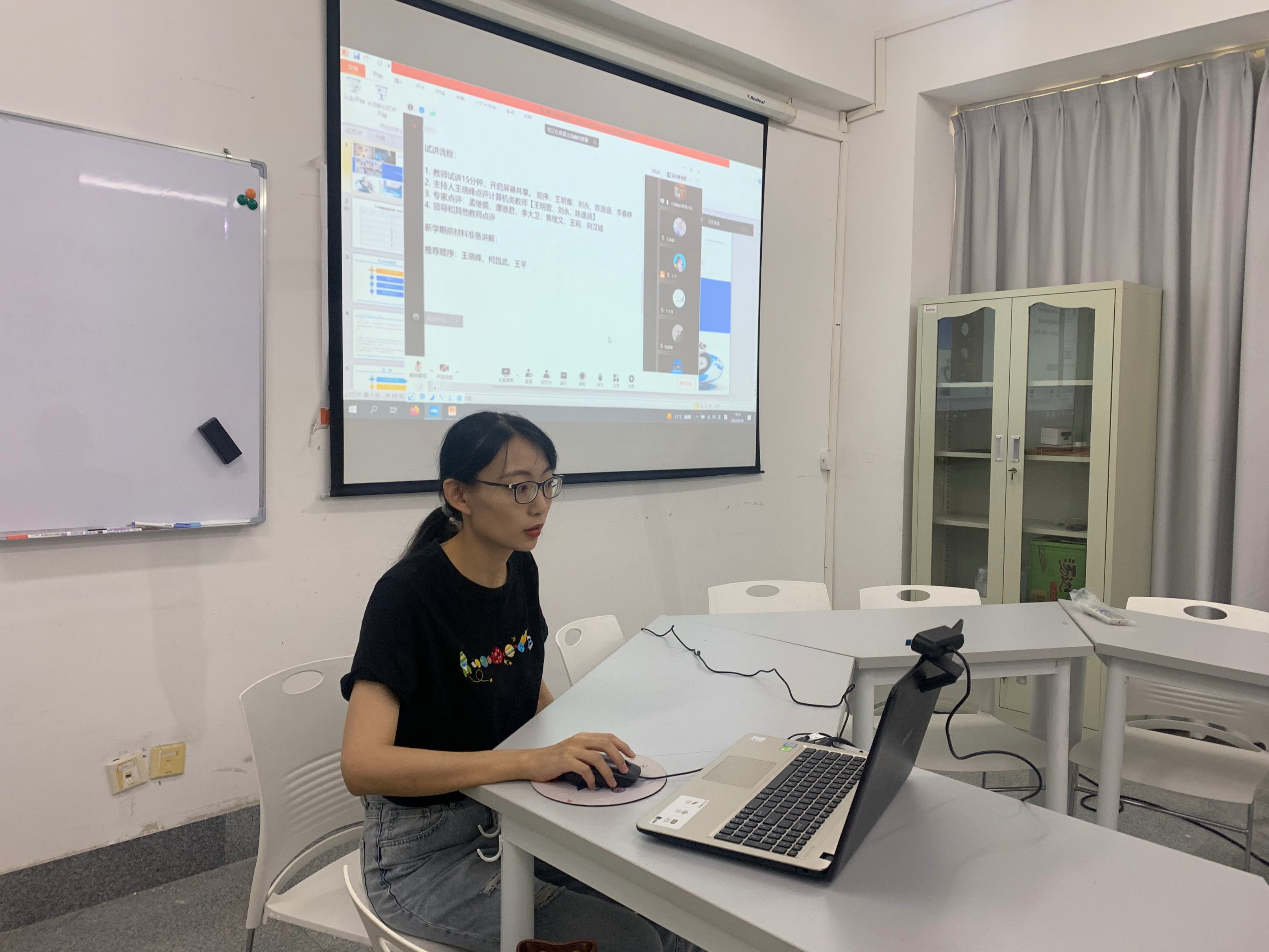 由于开学第一周为线上上课,部分教师未返校,8月18日15:00数据科学与大数据技术课程组、信息与计算科学课程组、智能科学与技术课程组以及大学数学课程组全体老师利用腾讯会议,线上线下结合,组织7、8月份新进的教师王明蕾、刘永、陈逸涵、李春婷进行了一场试讲。