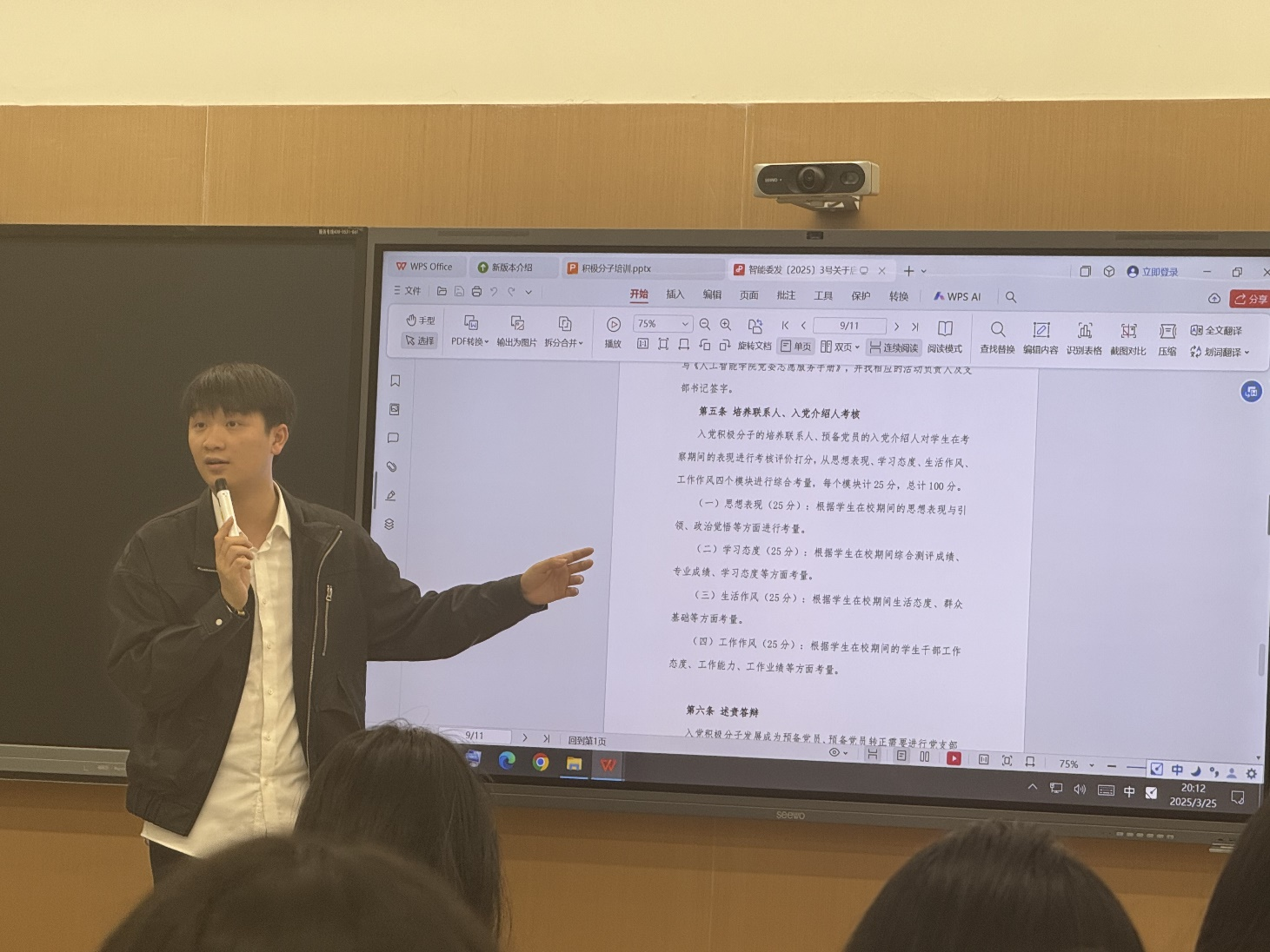 在培训会上,林益杭书记结合八项规定精神,围绕《友敏书院学生党支部发展党员工作流程图》《人工智能学院学生党员及入党积极分子考核实施办法(试行)》等重要文件,为大家带来了系统且深入的讲解与培训。
