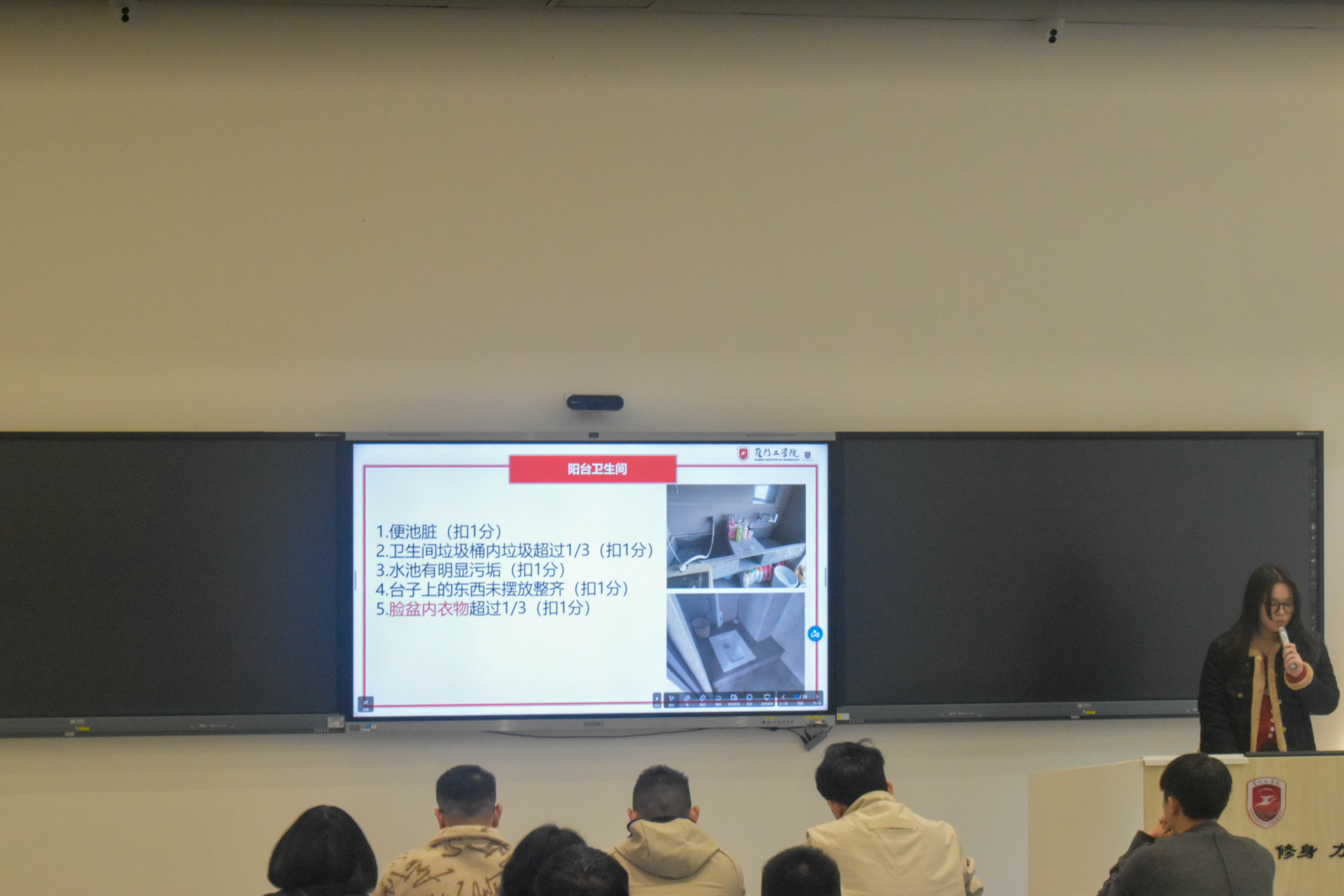 会议上,友敏学委会副主任程钰淇同学进行了卫生检查培训,细致地介绍了宿舍卫生检查的评分细则,讲解了如何系统地进行卫生检查,并举出了实际的案例就常见的卫生问题和解决方案进行了详细地分析。培训内容不仅涵盖了清洁标准、检查要点,还包括了如何发现并解决潜在的卫生问题。通过理论和实践的结合,同学们增强了责任意识与实际操作能力。