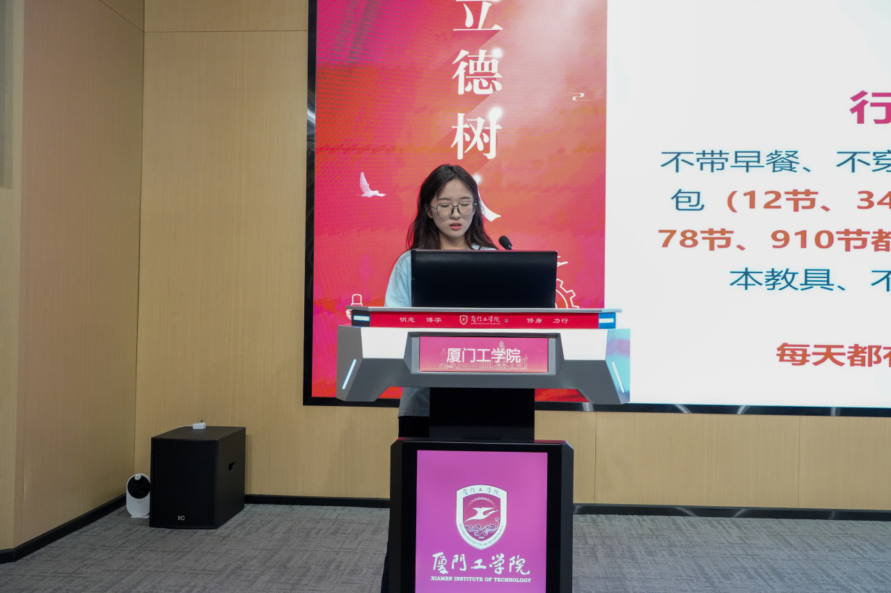 行政副院长郑小聪老师围绕厦门工学院本科教育教学审核评估工作三个阶段——入校前准备、线上评估、正式入校,跟各班级、学院干部和各寝室寝室长强调重点注意事项,涵盖日常行为习惯养成、出勤管理、课堂行为规范、校内与社区日常管理和防诈骗与安全五大方面。 通过学生课堂、宿舍两方面重点点明学生行为规范的具体要求。在教学管理方面,要求学生遵守课堂纪律,养成良好行为习惯与课后习惯。在宿舍管理上,对日常卫生、违规用品、晚间熄灯及查寝等方面均作出细致规定,每周定时或不定时检查日常卫生、排查违规用品,每日宿舍断电后检查阳台熄灯情况,安全纪律方面,强调控烟、违规物品排查、熄灯作息等重点。并说明全校禁烟,严禁外卖入校,健康跑需杜绝替跑、接力跑等舞弊行为。