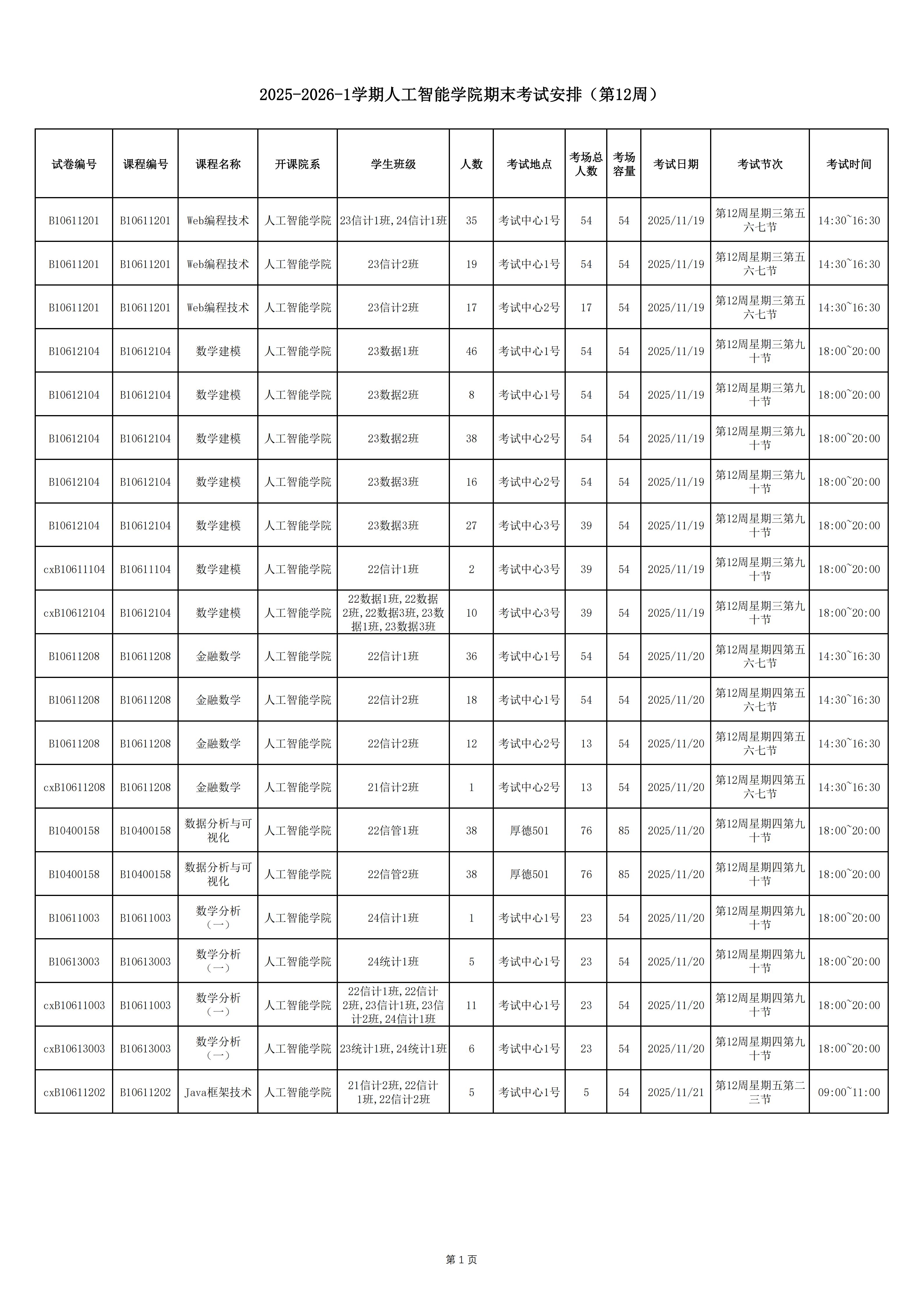 2025-2026-1学期人工智能学院期末考试安排(第12周)