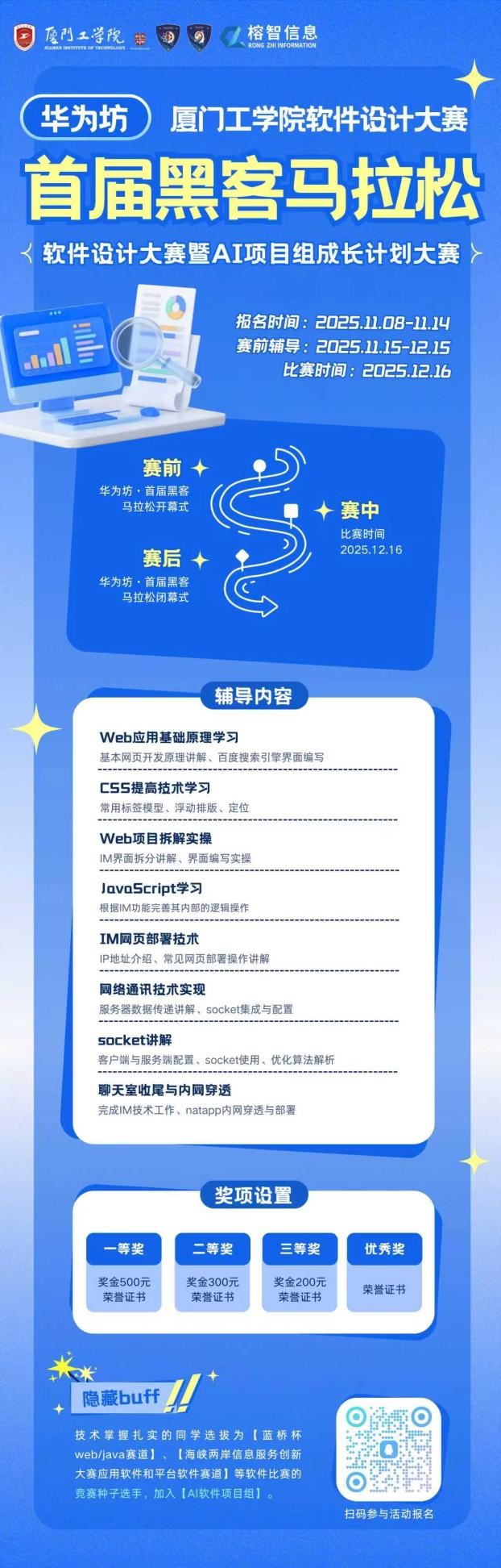 为响应国家数字经济发展号召,搭建科技创新实践平台,厦门工学院人工智能学院联合福州市榕智信息科技有限公司,正式启动“黑客马拉松AI软件开发专项大赛”暨AI项目组成长计划大赛。这场融合技能培训、实战比拼与人才选拔的科技盛宴,正面向厦门工学院全体同学火热招募,邀你用代码解锁潜力、赢取丰厚奖励!