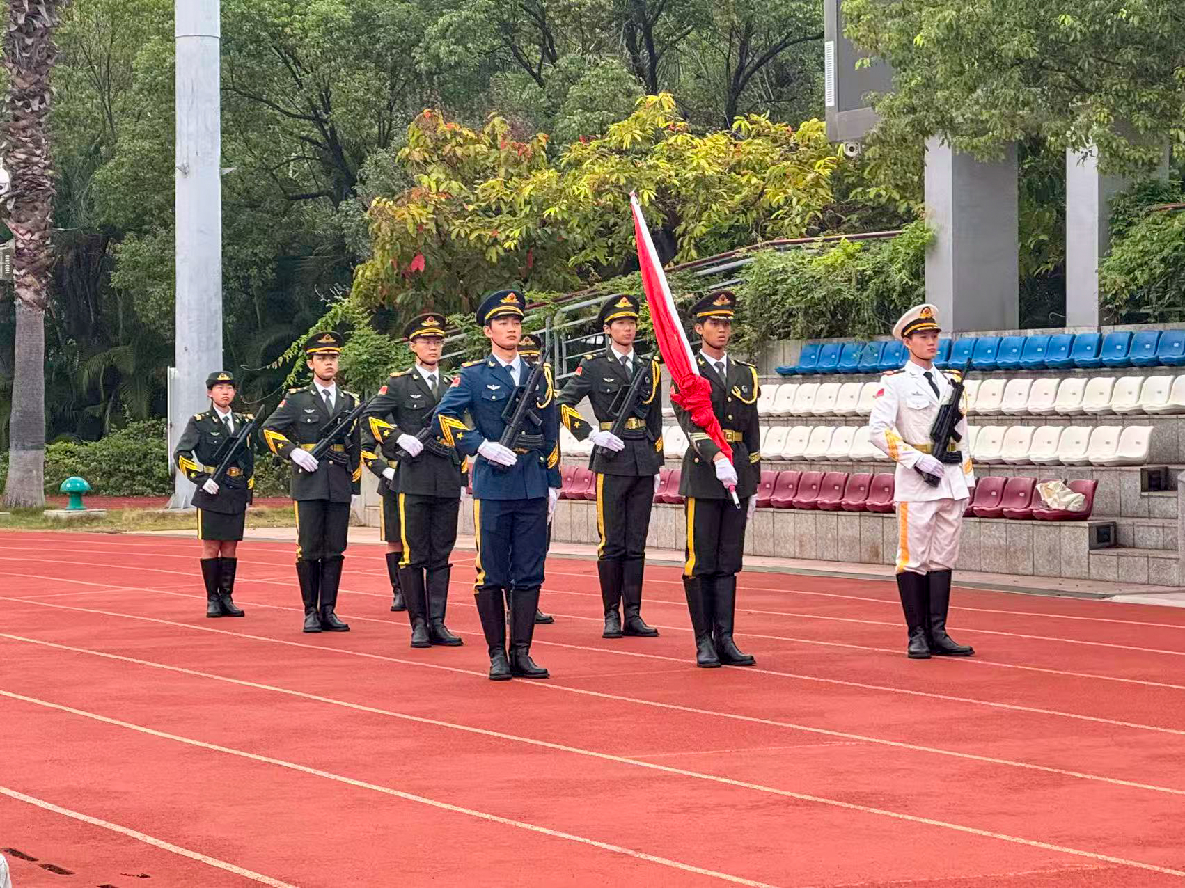 当清晨的第一缕阳光洒满广场,护旗队员们身着整齐制服,迈着铿锵有力的步伐护送五星红旗至旗杆下,肃立待命。激昂的鼓点划破清晨的宁静,国歌旋律随之奏响,鲜艳的五星红旗在全体师生的注目下缓缓攀升,最终迎风招展于旗杆顶端。师生们身姿挺拔,目光坚定地凝视着国旗,心中满是崇敬与自豪,整个广场沉浸在庄严肃穆的氛围中。这场升旗仪式不仅是一次简单的仪式,更是一堂生动的爱国主义教育课,凝聚着两院师生的爱国情怀与集体向心力。