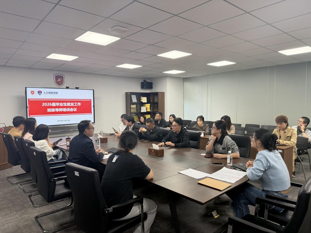 为扎实推进2026届毕业生就业工作,全面提升班级导师就业指导服务能力,精准助力毕业生高质量就业,11月25日,人工智能学院召开2026届毕业生就业工作班级导师培训会议。学院党委书记、执行院长谢志春,党委副书记、行政副院长郑小聪,毕业班班级导师及辅导员参加会议。