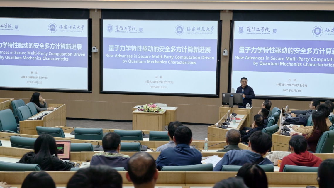 12月23日下午,人工智能学院邀请福建师范大学林崧教授在合一报告厅开展《量子力学特性驱动的安全多方计算新进展》专题学术讲座,本次讲座围绕量子四则计算、量子集合计算等复杂计算问题的最新研究成果,为我院教师科研探索开辟新思路。