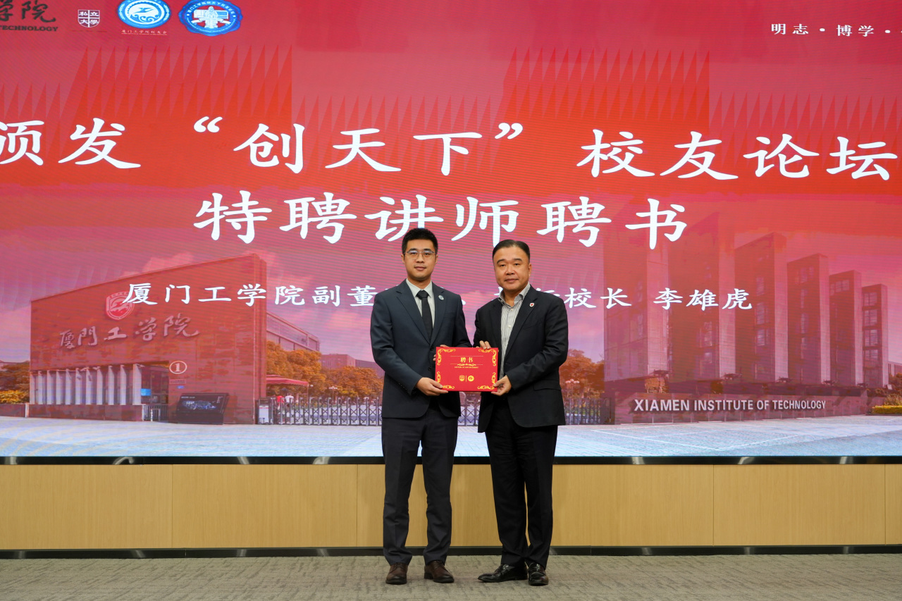 为表彰柴源校友在行业内的卓越表现与突出贡献,厦门工学院副董事长、执行校长李雄虎为柴源校友颁发“创天下”校友论坛讲座特聘讲师聘书。这份聘书不仅是对柴源校友专业能力的认可,更是连接母校与校友的深厚纽带。