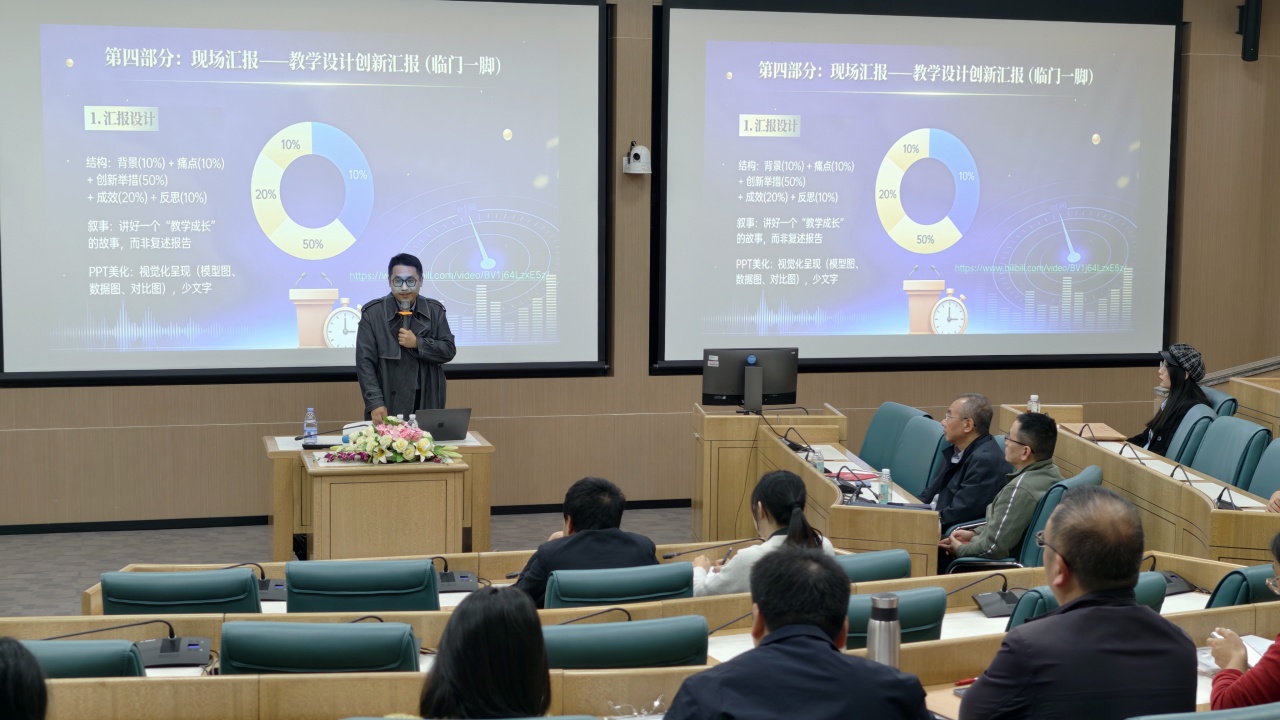 在实证材料准备环节,陈博士强调课堂教学实录需选择最能体现教学设计闭环与师生互动效果的章节,杜绝表演痕迹,真实呈现“以学生为中心”的教学常态;在现场展示部分,他详细讲解了教学设计创新汇报的结构框架与答辩技巧,提醒教师注重逻辑连贯、观点鲜明,以理论支撑结合教学案例回应评委关切。