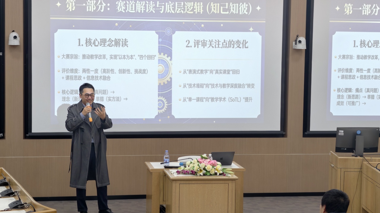 专题分享中,陈伟思博士围绕“以赛促改”核心主题,从多维度展开深度解析。在赛道解读与底层逻辑板块,他对比了青教赛与教创赛的核心差异,阐释“痛点-理念-举措-成效-推广”的核心备赛逻辑。针对大赛核心材料,陈博士重点拆解了教学创新成果报告的撰写技巧,提出“小切口,深挖掘”的选题策略,指导教师摒弃“伪问题”、聚焦“真问题”,将“四新”建设要求与课程思政元素有机融入报告,凸显创新特色与推广价值。