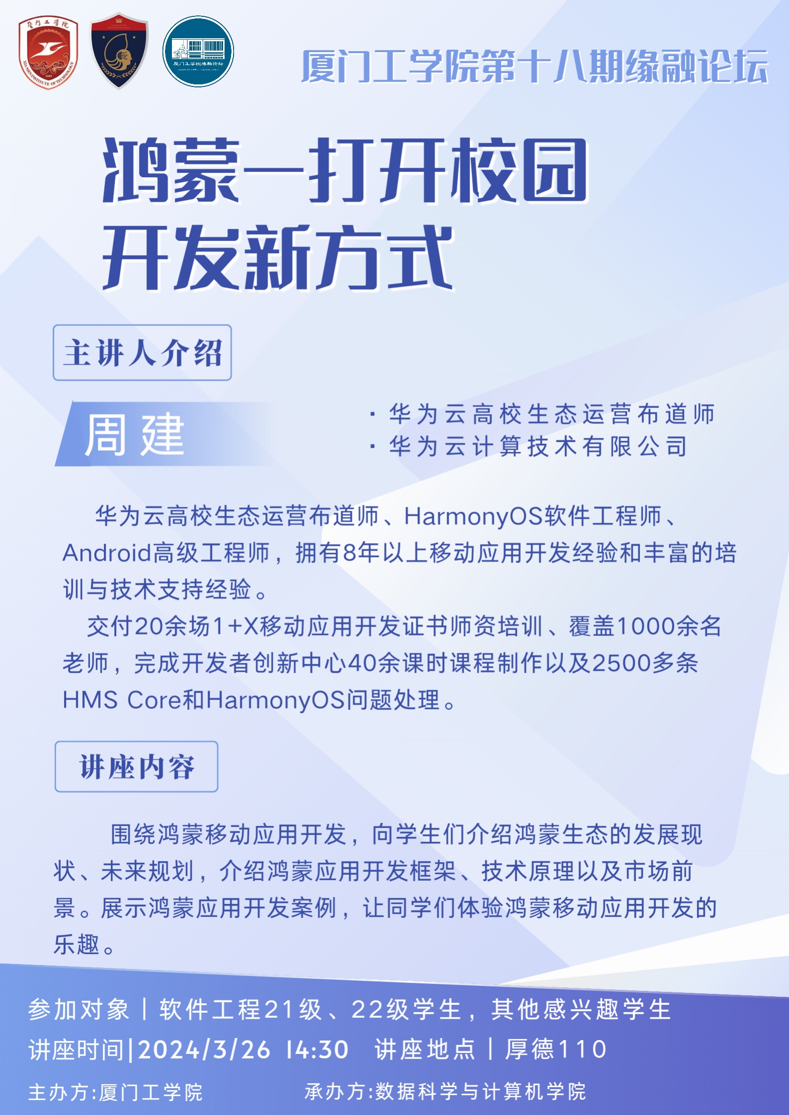 厦门工学院|缘融论坛第十八期主题:鸿蒙——打开校园开发新方式