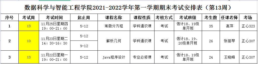 (第13周)2021-2022学年第一学期专业课期末考试安排表