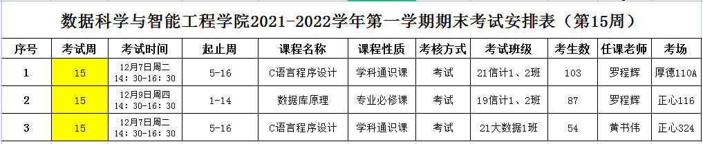 (第15周)2021-2022学年第一学期专业课期末考试安排表