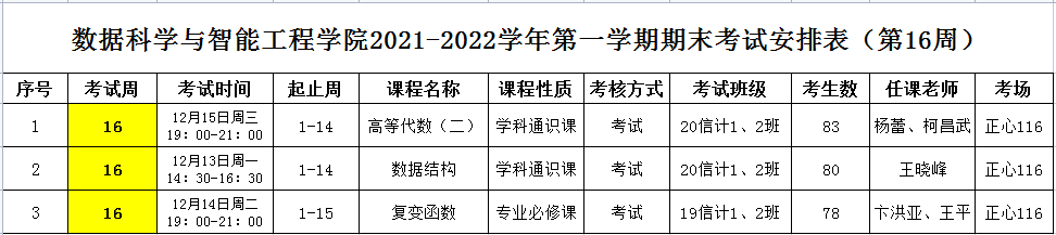 (第16周)2021-2022学年第一学期专业课期末考试安排表