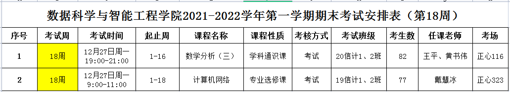 (第18周)2021-2022学年第一学期专业课期末考试安排表