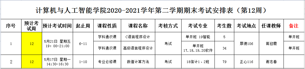 (第12周)2020-2021学年第二学期专业课期末考试安排表