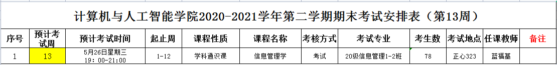 (第13周)2020-2021学年第二学期专业课期末考试安排表