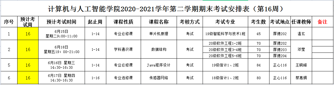 (第16周)2020-2021学年第二学期专业课期末考试安排表