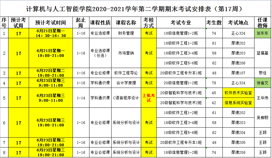 (第17周)2020-2021学年第二学期专业课期末考试安排表