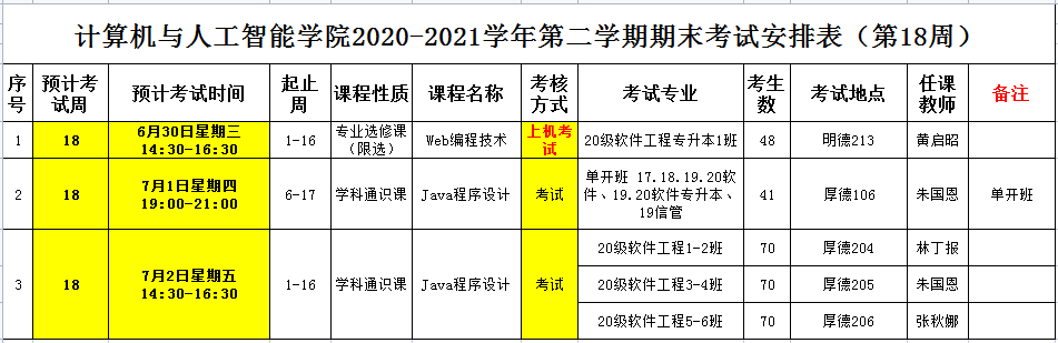 (第18周)2020-2021学年第二学期专业课期末考试安排表