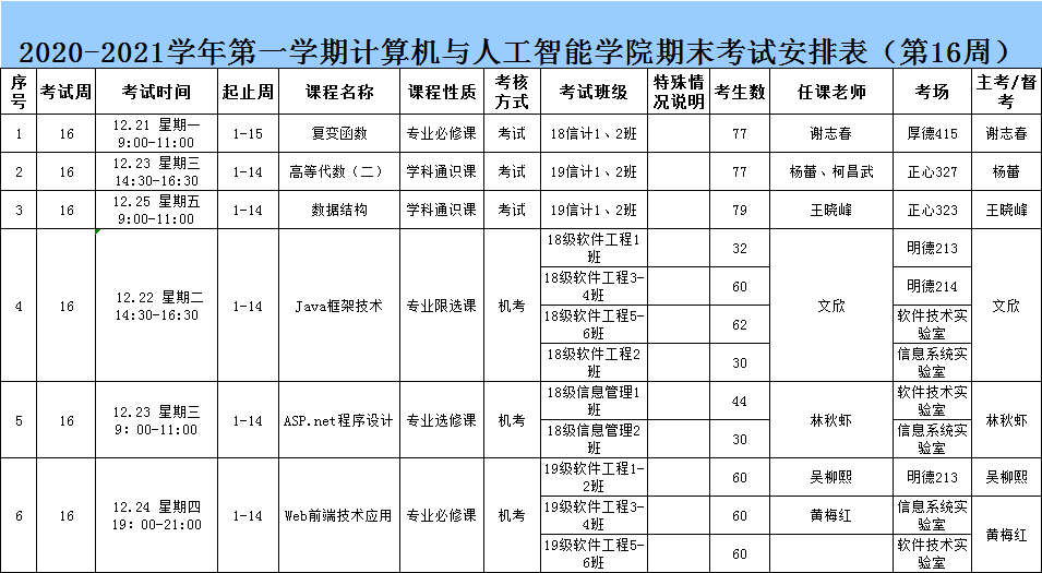 计算机与人工智能学院2020-2021学年第一学期期末考试安排表(第16周)