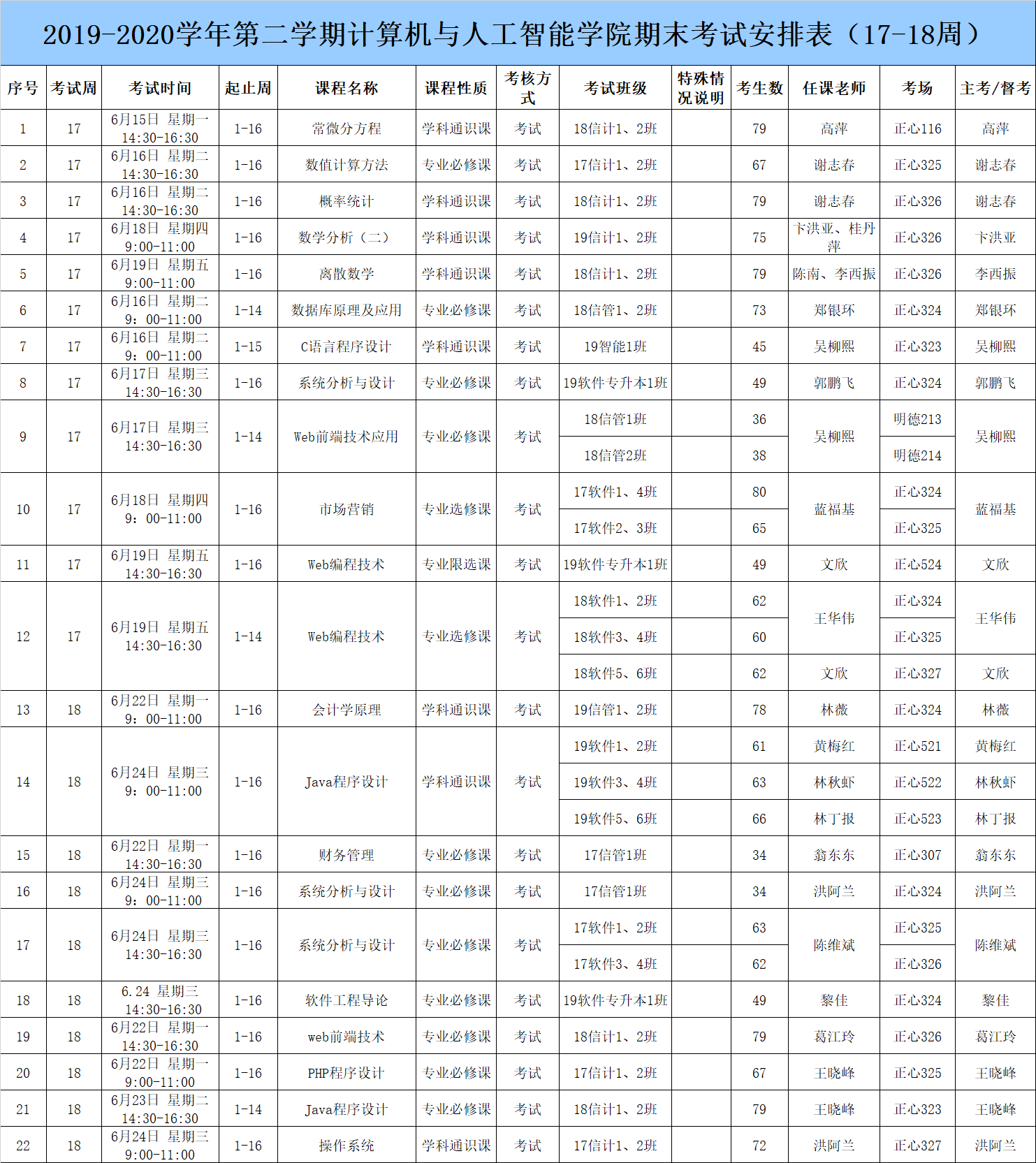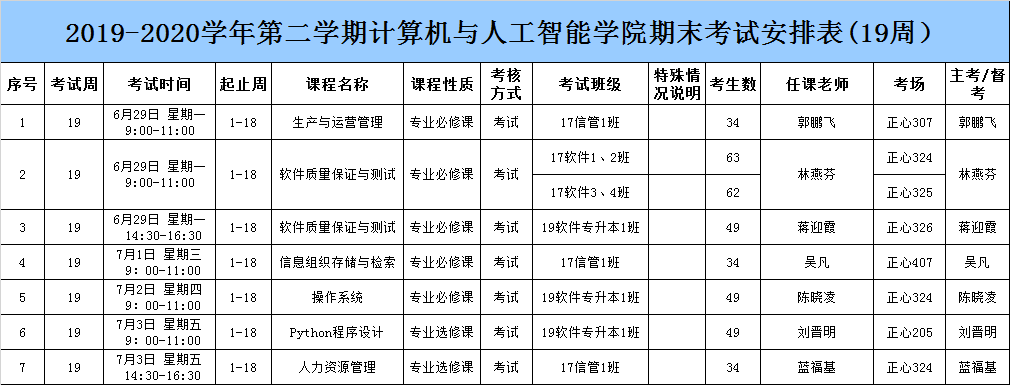 2019-2020学年第二学期计算机与人工智能学院期末考试安排表(17-18周)