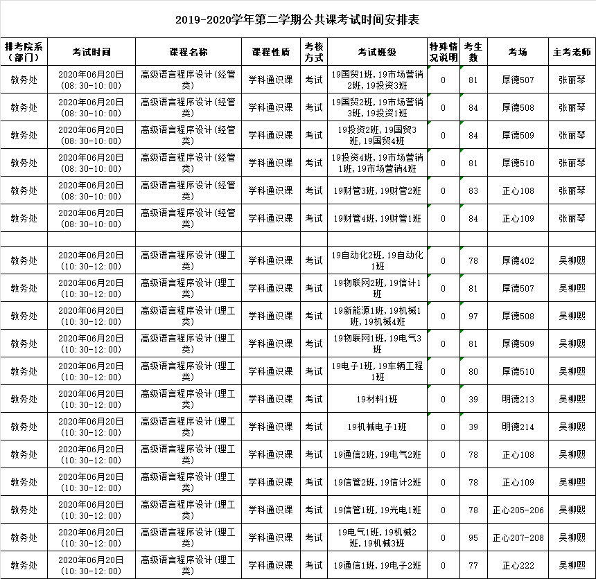 2019-2020学年第二学期期末公共课考试时间安排(含补考)