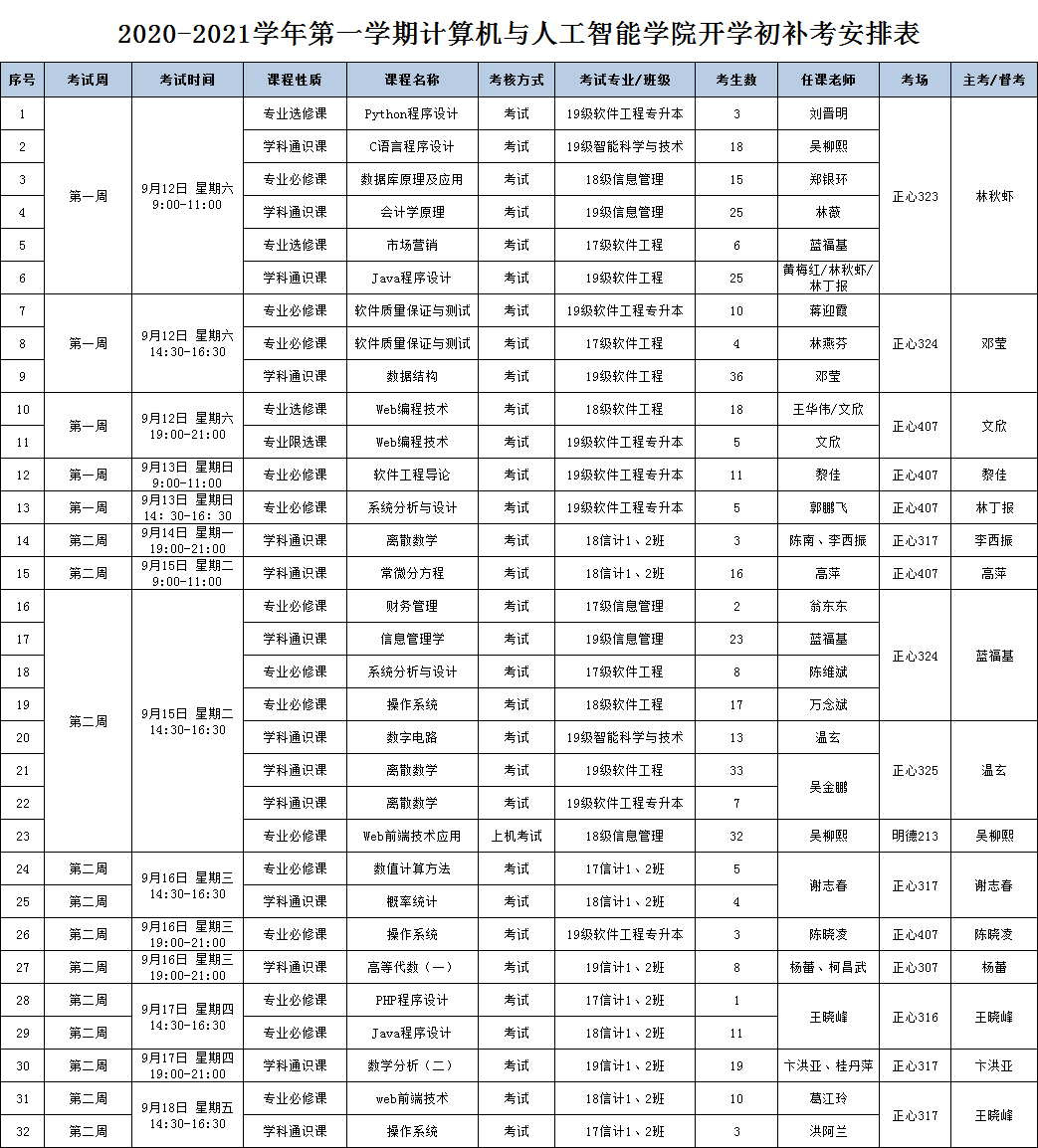 2020-2021学年第一学期计算机与人工智能学院开学初补考安排表