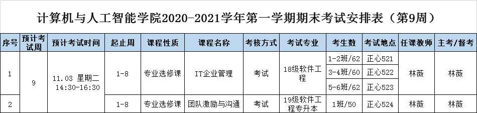 计算机与人工智能学院2020-2021学年第一学期期末考试安排表(第9周)