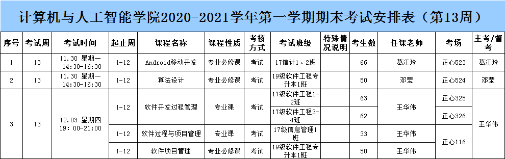 计算机与人工智能学院2020-2021学年第一学期期末考试安排表(第13周)