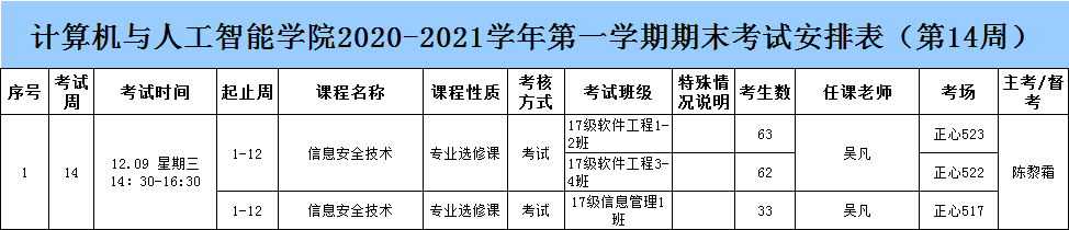计算机与人工智能学院2020-2021学年第一学期期末考试安排表(第14周)