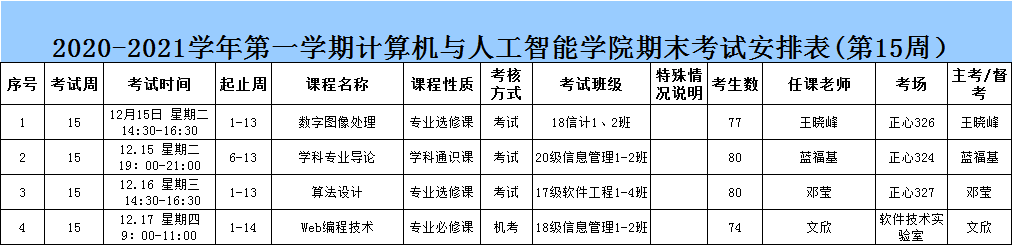 计算机与人工智能学院2020-2021学年第一学期期末考试安排表 (第15周)