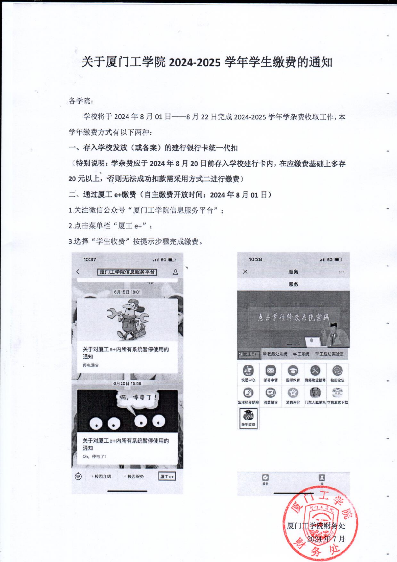 【校内】关于厦门工学院2024-2025学年老生缴费的通知