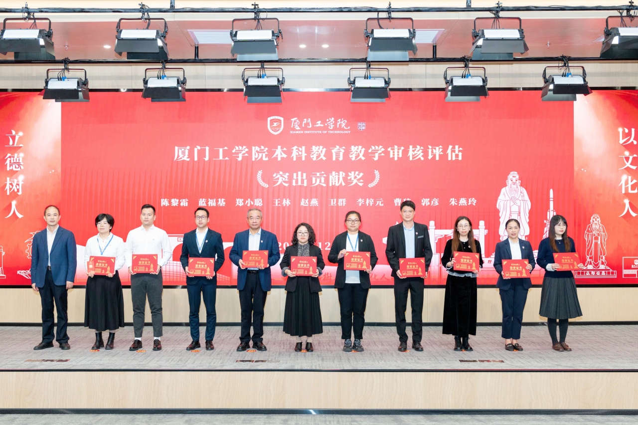 苏涵校长,校党委朱瑞元书记,李雄虎副董事长、执行校长,李咏梅副校长,李文副校长颁发“厦门工学院本科教育教学审核评估突出贡献奖”。