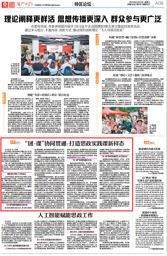 2025年9月23日,《厦门日报》A08版“特区论坛”专栏刊发我校纪凤媚、李文、邵晴老师的文章《“团・课”协同贯通:打造有特色的思政实践课新样态》,专题报道了我校积极探索推动共青团工作有机嵌入思政课教学主渠道,通过建设大学生理论宣讲轻骑兵的实践探索,取得了显著的成效,为推动高校共青团高质量参与思政课实践教学及高校思政教育改革创新提供了新的思路和方法。