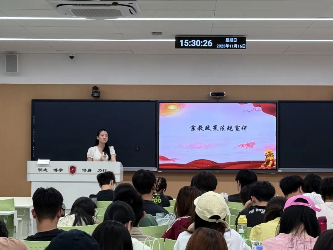 11月16日下午,校党委统战部副部长林燕萍老师开展“民族宗教政策法规宣讲”专题讲座,从铸牢中华民族共同体意识与宗教政策法规知识维度,系统解读政策,扎牢党员理想信念,提升政治判断力、政治领悟力、政治执行力。