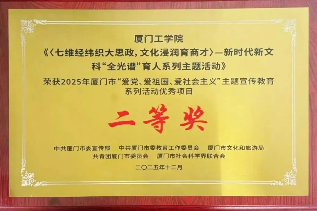 2025年12月28日,厦门工学院团委带领学生参加厦门市“爱党、爱祖国、爱社会主义”主题宣传教育总结展示活动,荣获“优秀项目二等奖”、“优秀组织奖”荣誉!