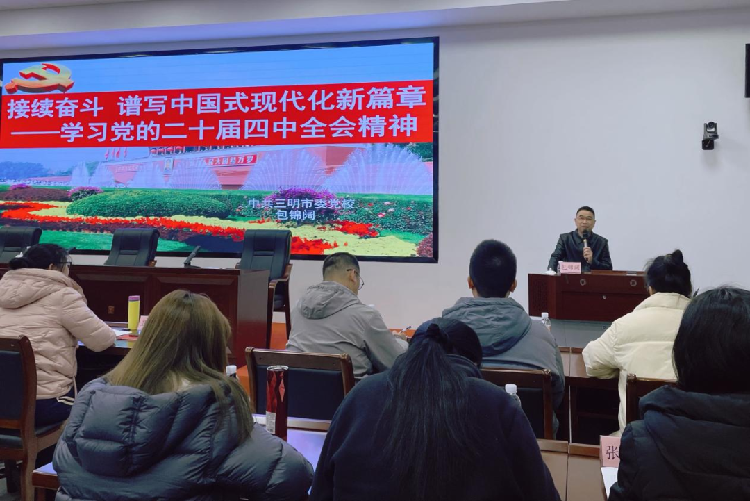 培训期间,三明市委党校副校长包锦阔作了题为“接续奋斗 谱写中国式现代化新篇章——学习贯彻党的二十届四中全会精神”的专题辅导报告。他紧密结合国内外发展形势与三明本地实际,运用生动案例和详实数据,系统阐释了全会精神的深刻内涵,为学员们进一步理解、把握全会精神的核心要义提供了重要指导。