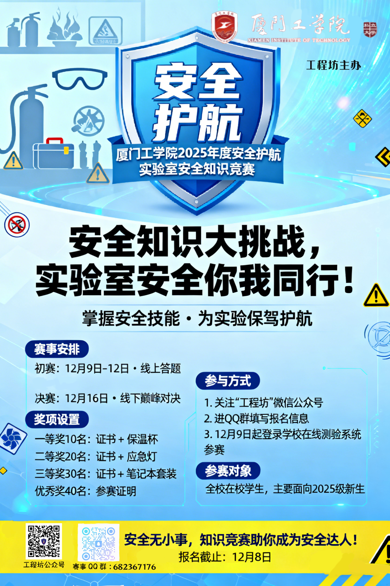 现在机会来啦!由厦门工学院工程坊主办的2025年度 “安全护航” 实验安全知识竞赛正式启动,主打一个 “学安全技能,赢实用好礼”,全校同学(尤其是2025级新生)别错过~