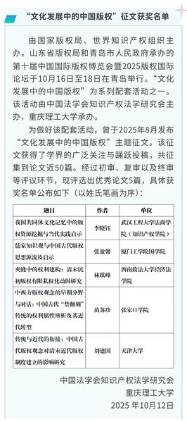 “文化发展中的中国版权”分论坛同期举行,由中国法学会知识产权法学研究会主办,重庆理工大学重庆知识产权学院等单位共同承办。论坛聚焦“文化发展中的中国版权”,旨在推动中华优秀传统法律文化的创造性转化、创新性发展,深化中国版权历史文化研究交流,助力文化强国与知识产权强国建设。