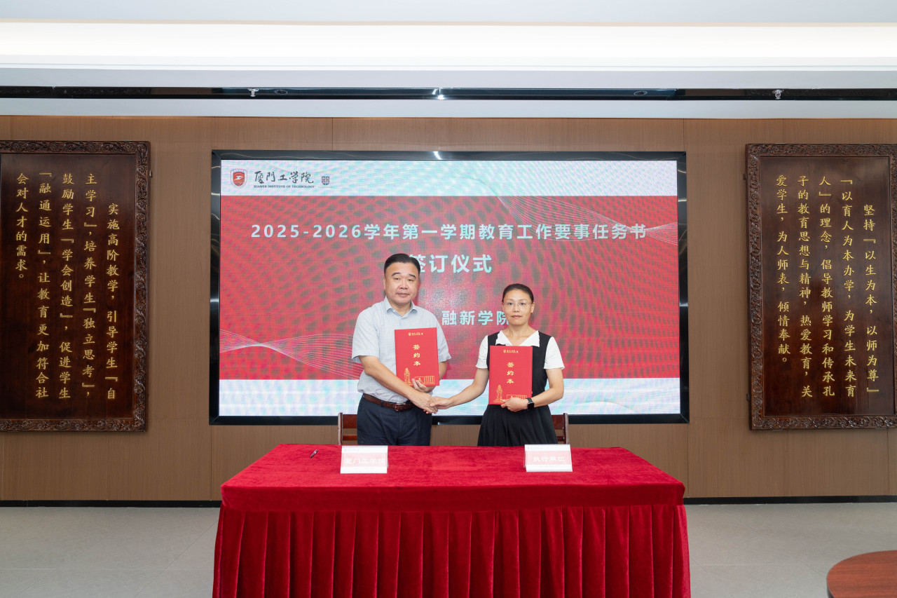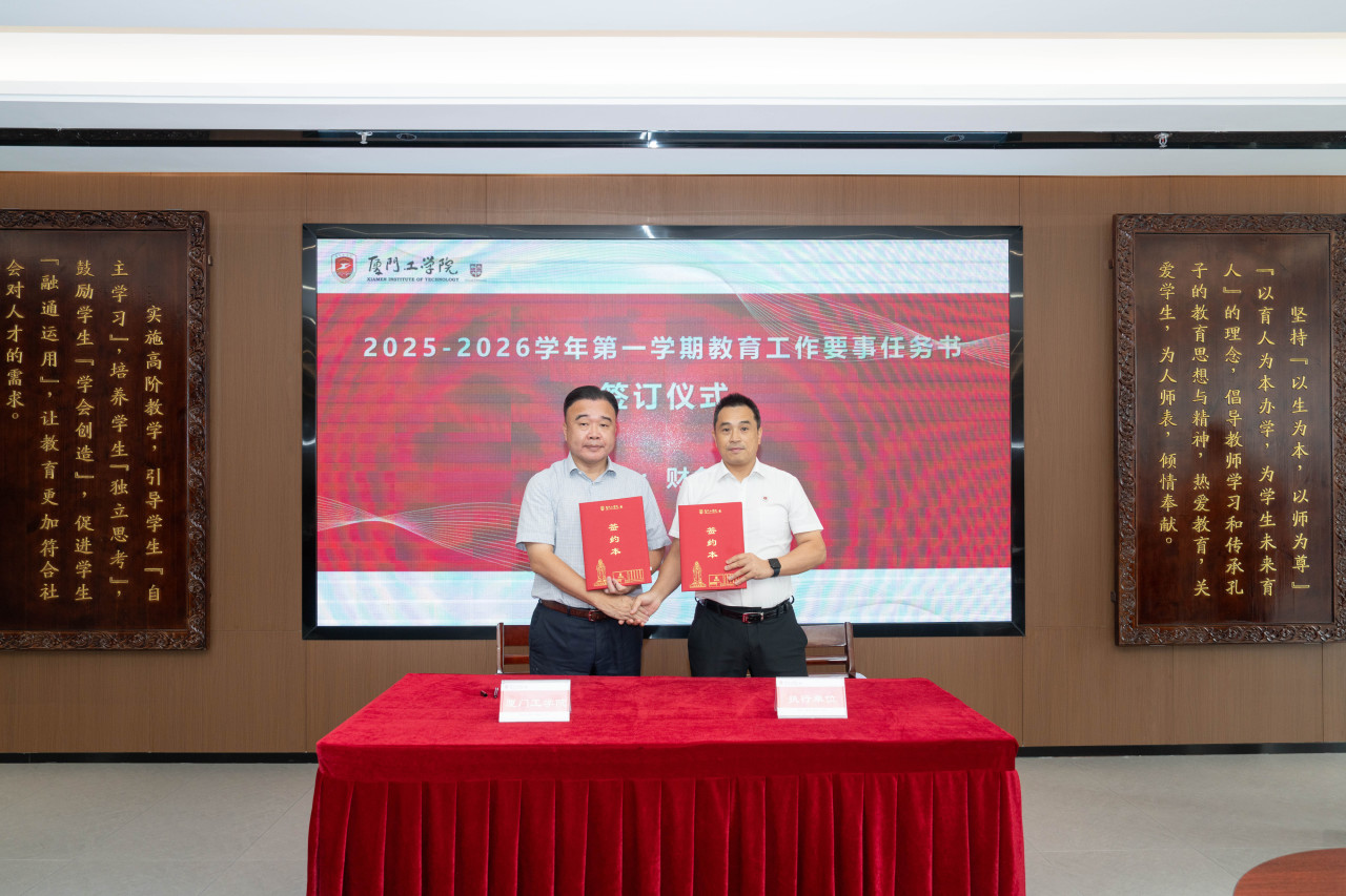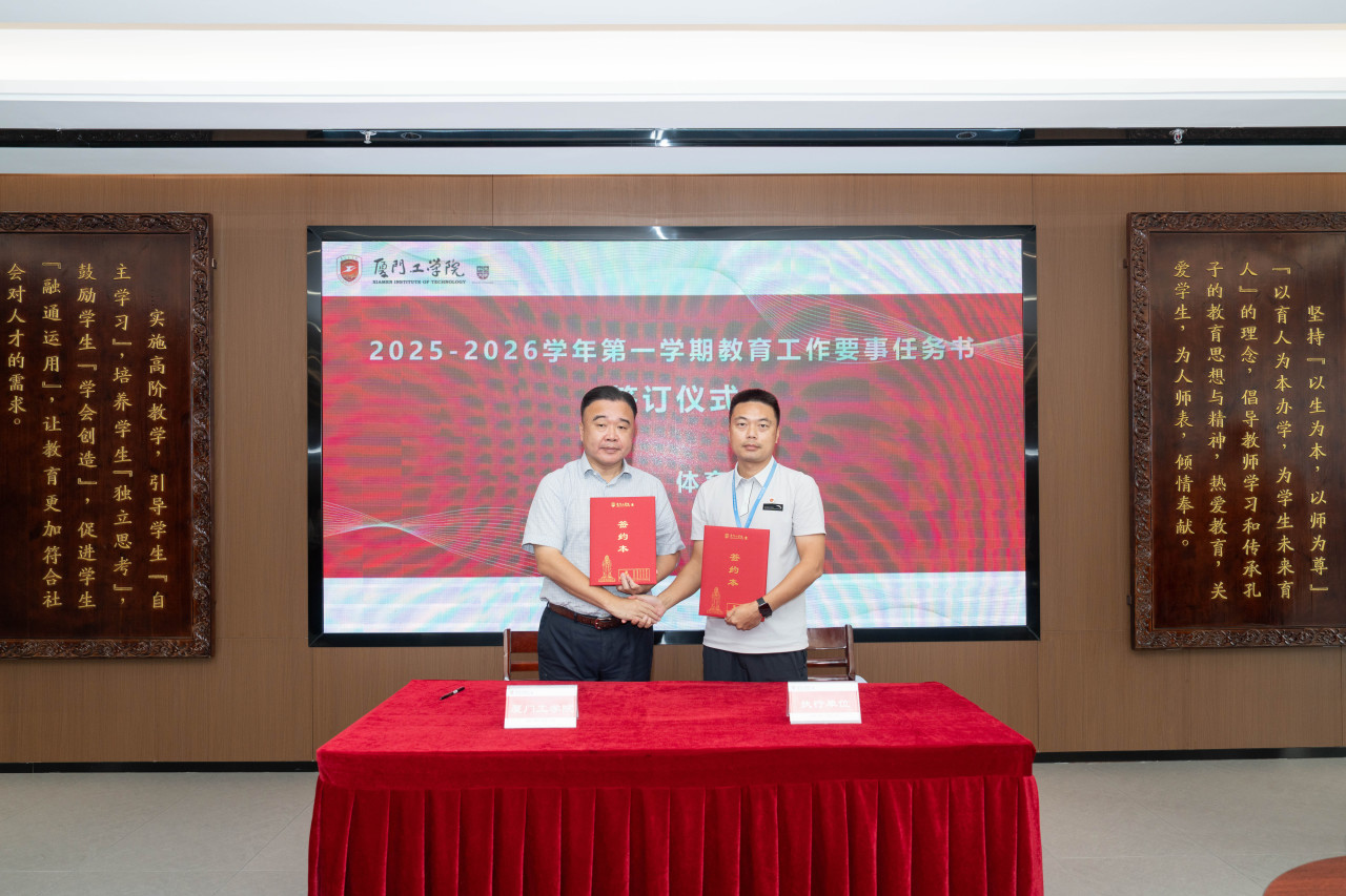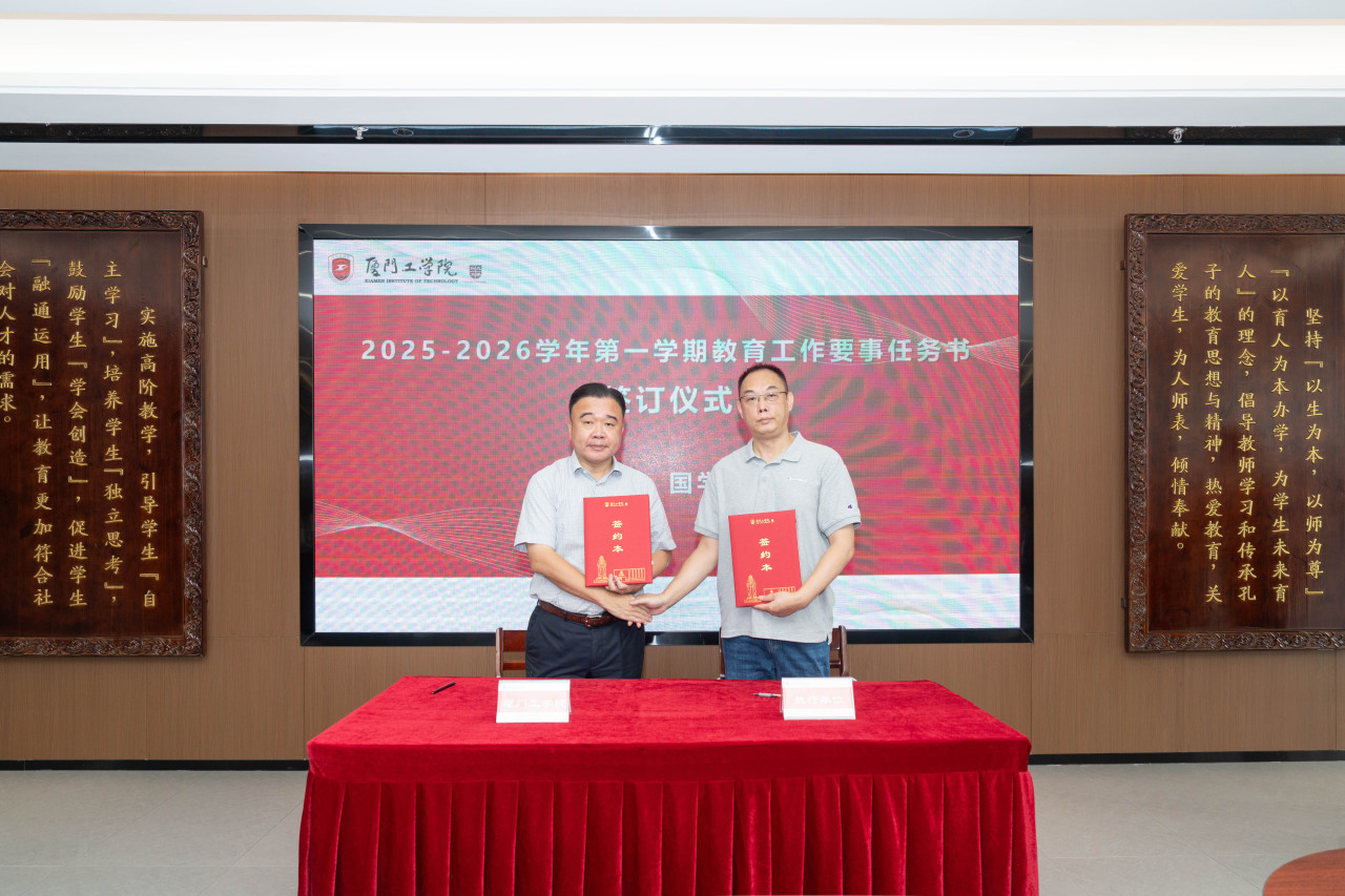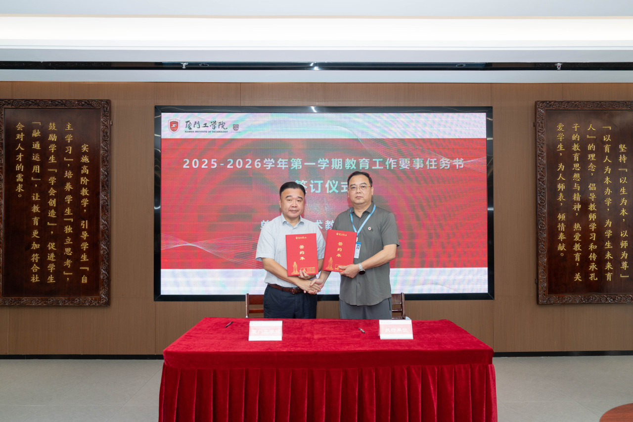2025年9月26日上午,厦门工学院2025-2026学年第一学期教育工作要事任务书签署仪式在政务大厦广新堂举行。苏涵校长,校党委朱瑞元书记,李雄虎副董事长、执行校长,张凯副校长,各学院、行政、教辅单位负责人及学校要事兼职成员共80余人共同参会。