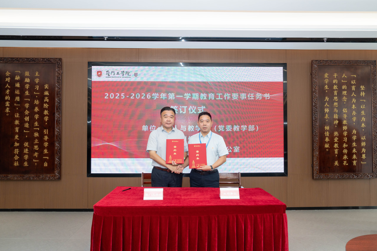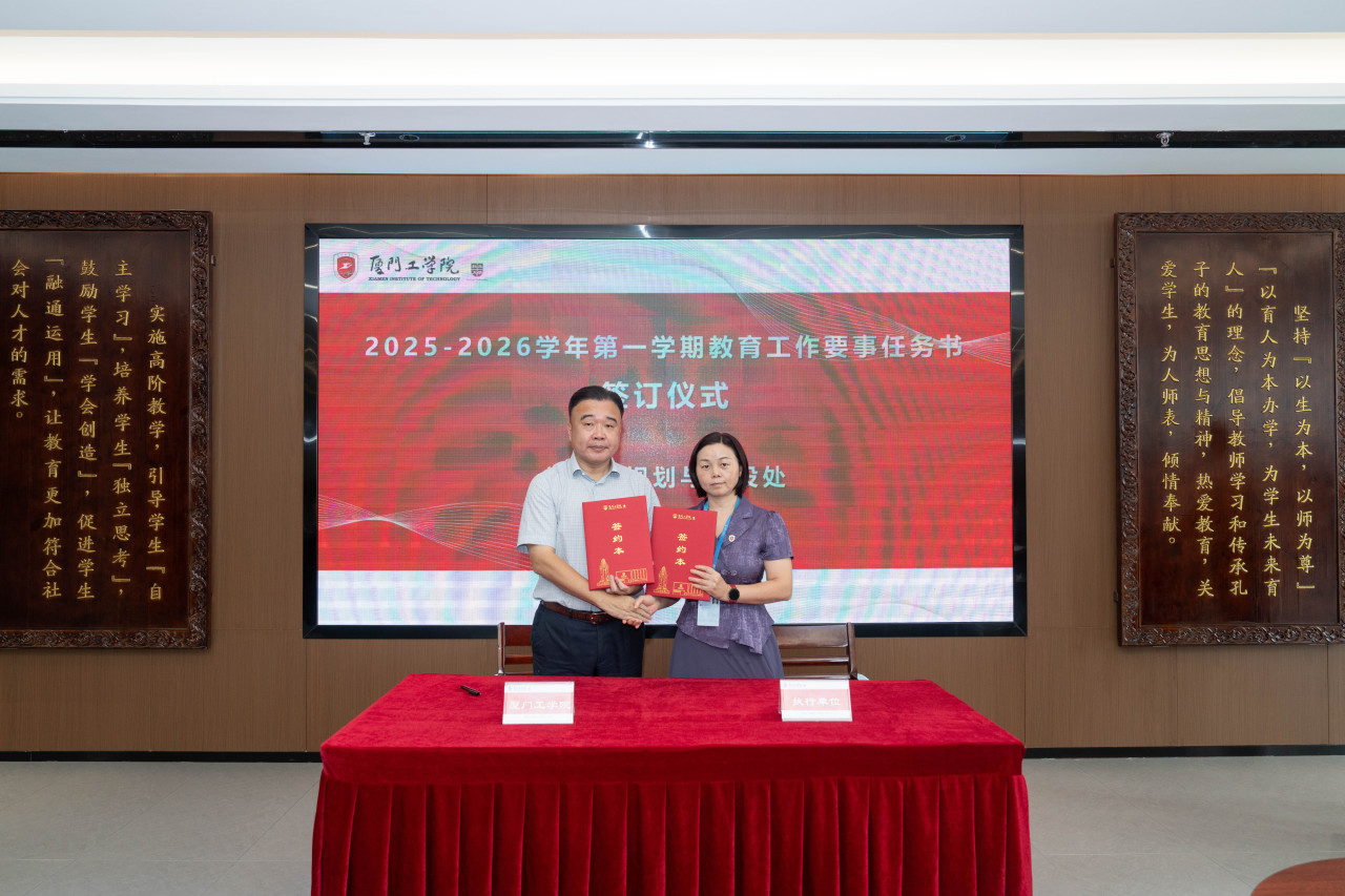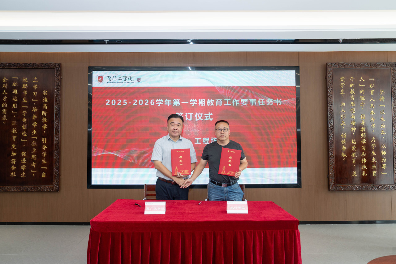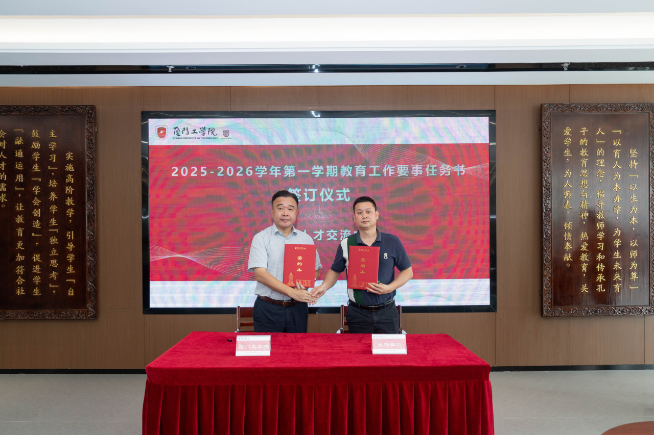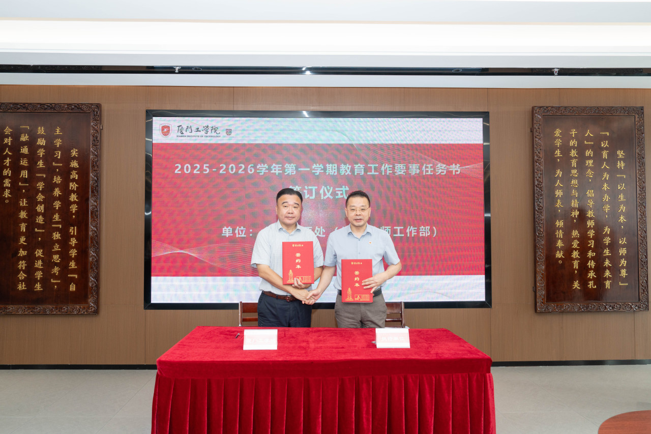 2025年9月26日上午,厦门工学院2025-2026学年第一学期教育工作要事任务书签署仪式在政务大厦广新堂举行。苏涵校长,校党委朱瑞元书记,李雄虎副董事长、执行校长,张凯副校长,各学院、行政、教辅单位负责人及学校要事兼职成员共80余人共同参会。