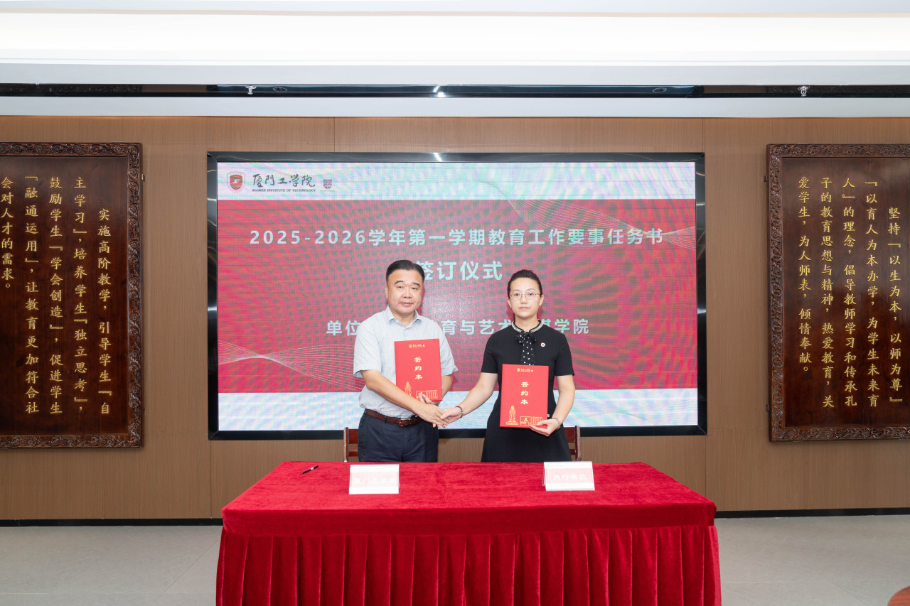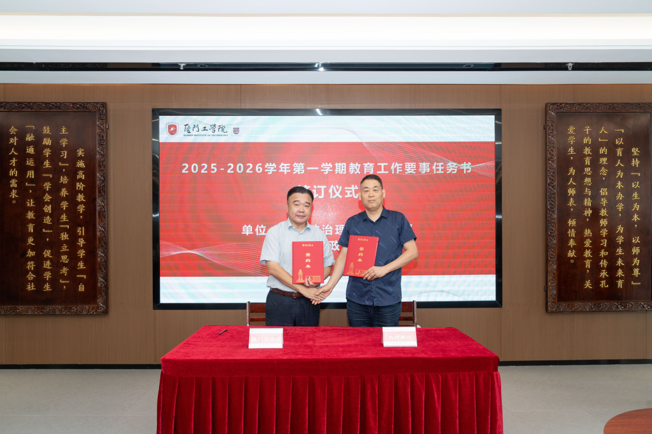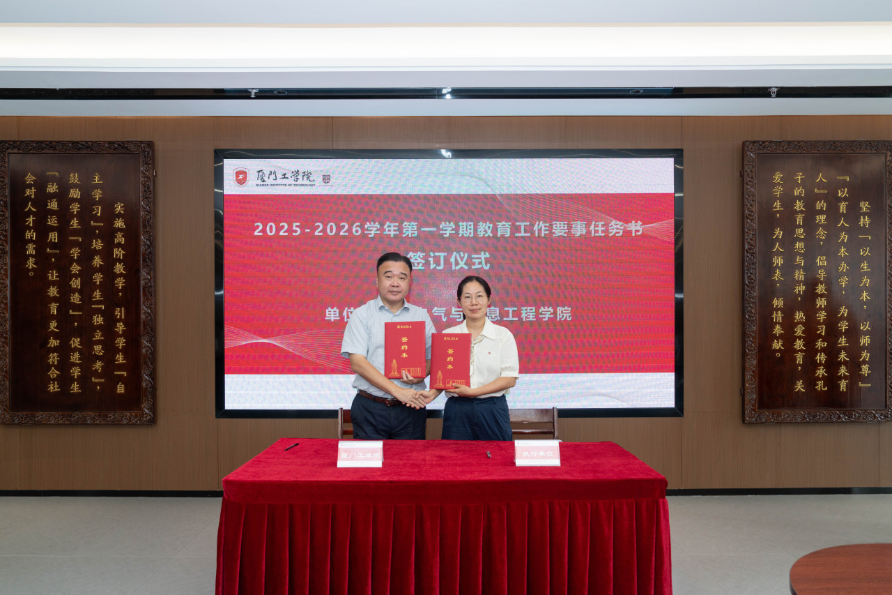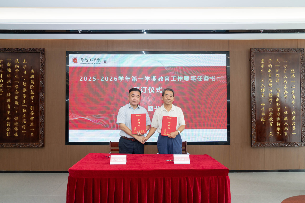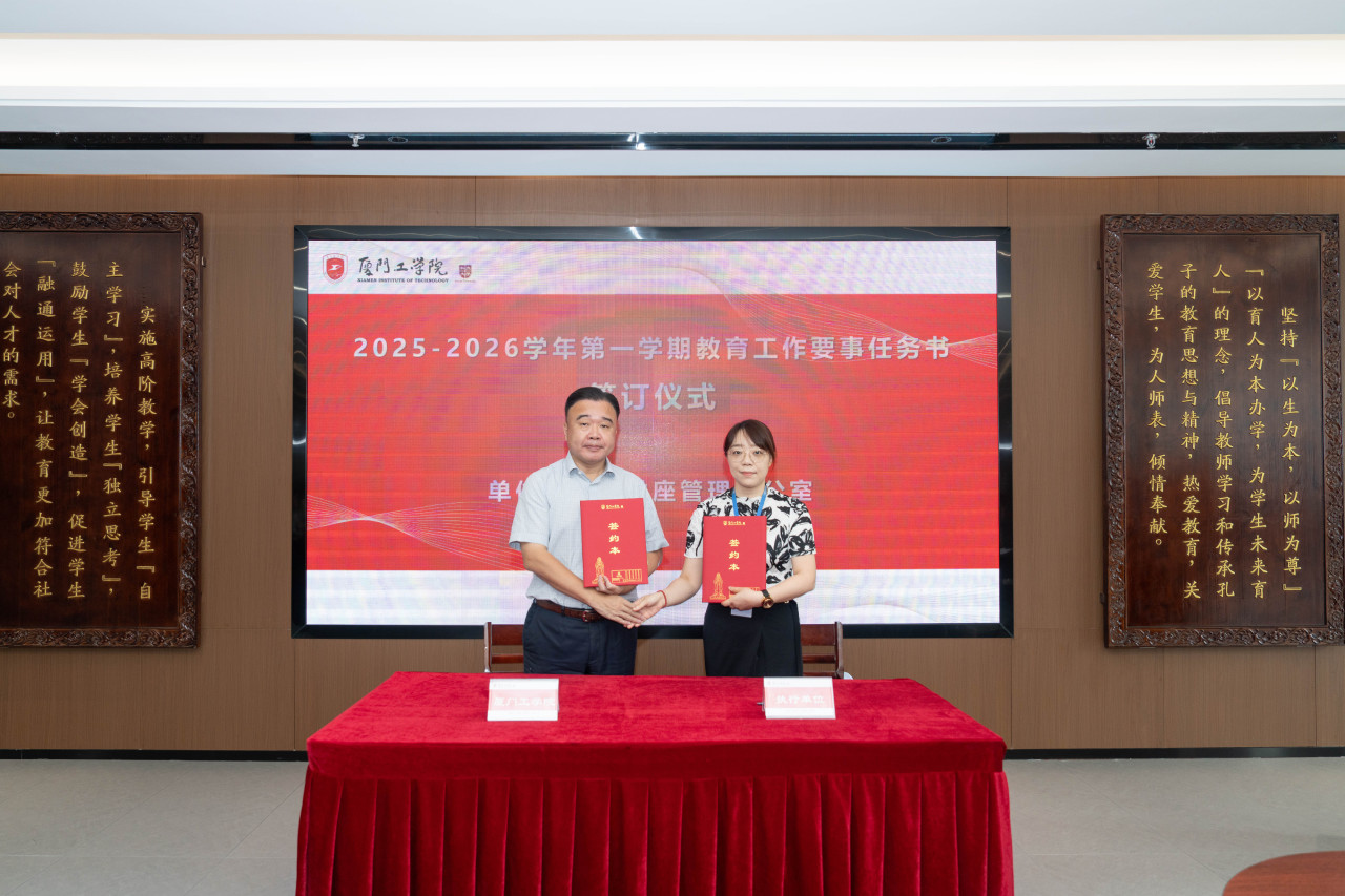 2025年9月26日上午,厦门工学院2025-2026学年第一学期教育工作要事任务书签署仪式在政务大厦广新堂举行。苏涵校长,校党委朱瑞元书记,李雄虎副董事长、执行校长,张凯副校长,各学院、行政、教辅单位负责人及学校要事兼职成员共80余人共同参会。