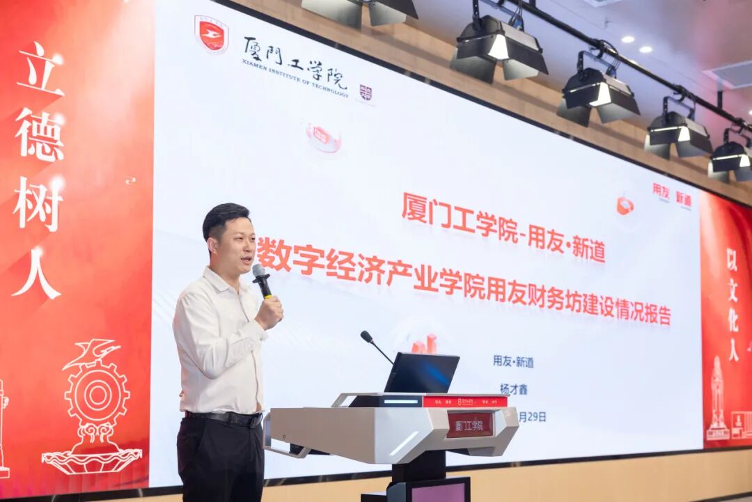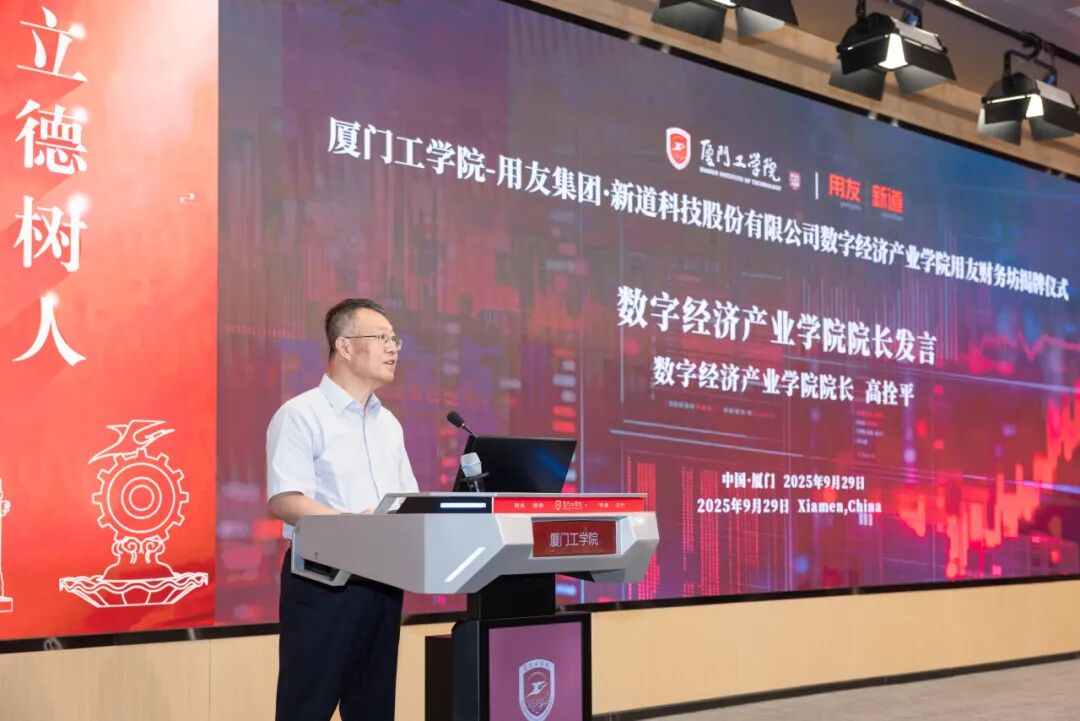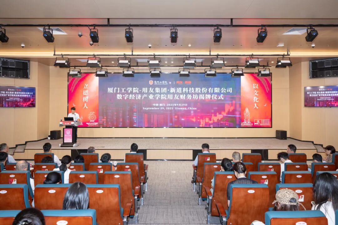 2025年9月29日上午,厦门工学院与用友集团·新道科技合作共建的数字经济产业学院用友财务坊揭牌仪式在立林学术报告厅举行。校企双方代表、师生代表共同见证这一产教融合新平台的启动。