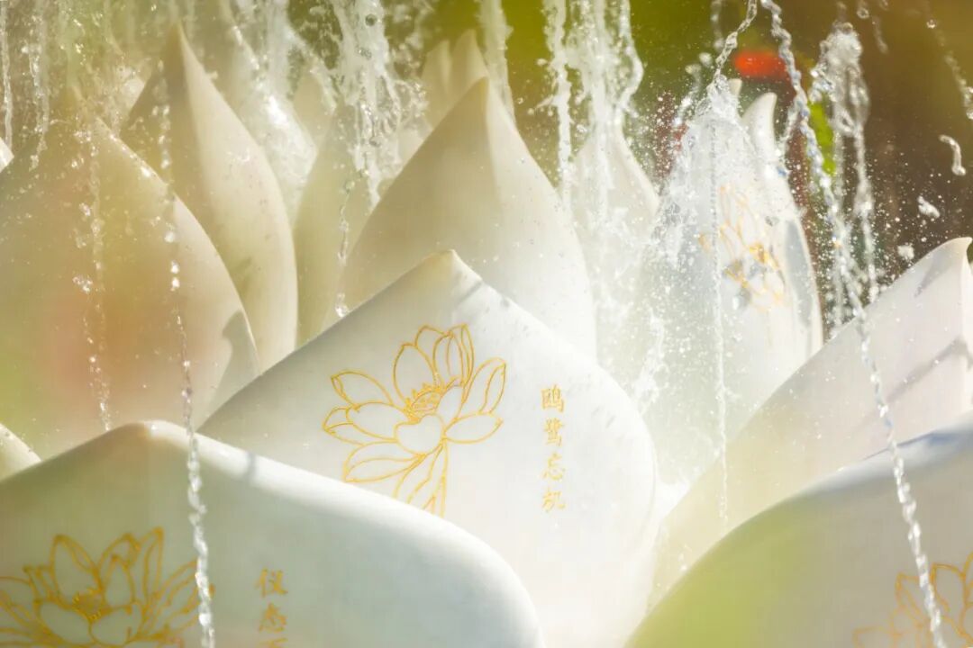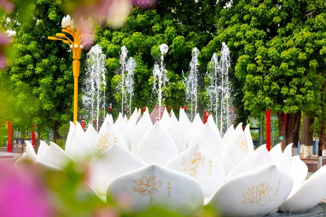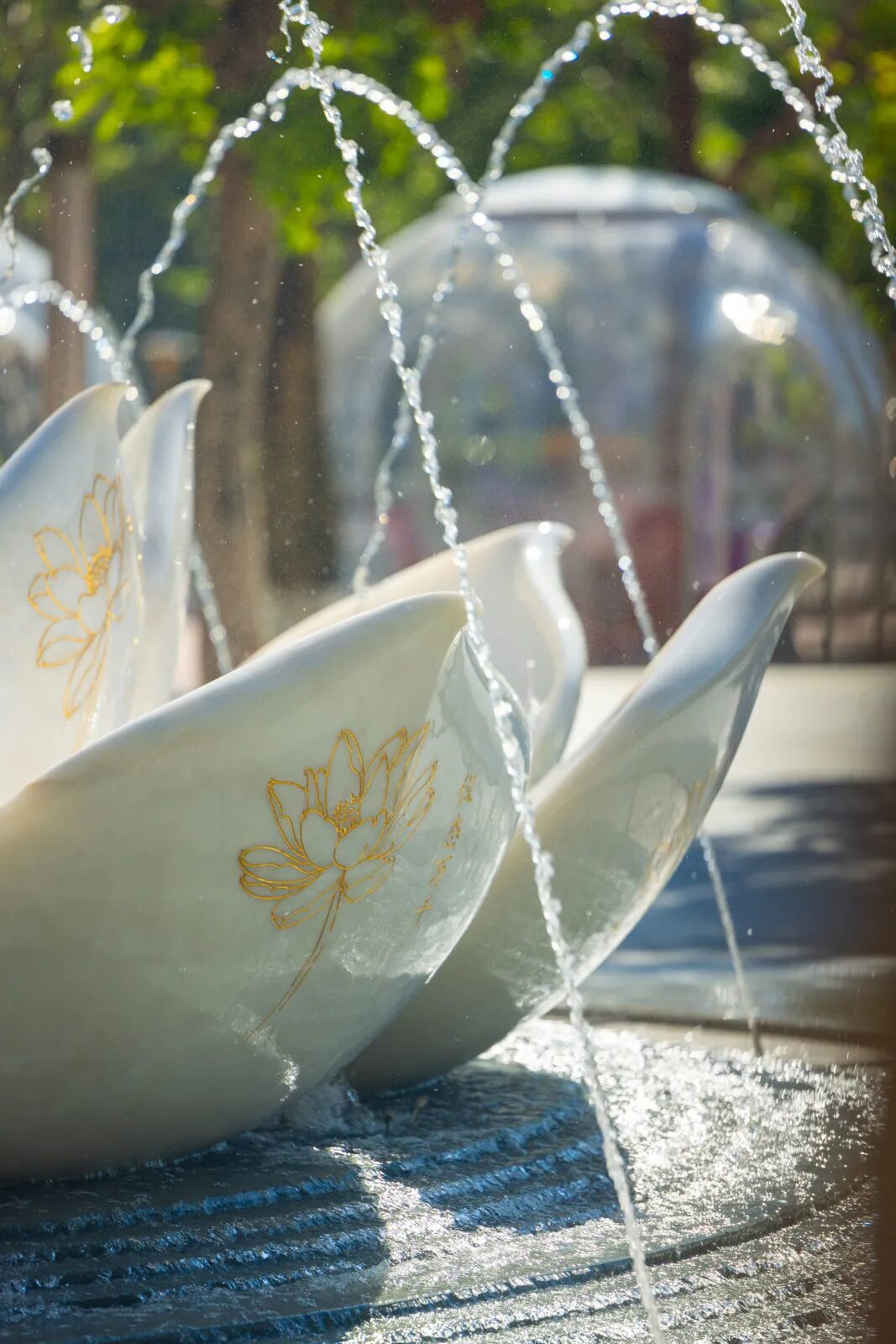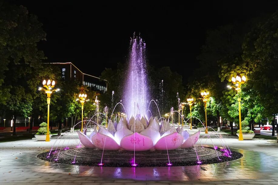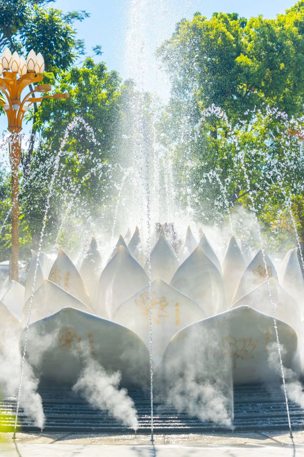 清泉自莲心涌出,依着乐声起伏回旋。时而潺潺如私语,时而激越似弦鸣,水与石莲相谐共舞,教人驻足神驰。待到暮色四合,灯光渐起,整座水景便化作一朵流光溢彩的莲灯,在水波间摇曳生姿,恍若洛神凌波,惊鸿照影。