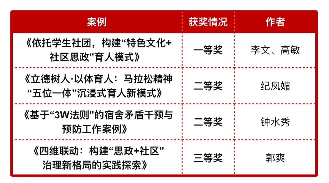 我校获奖案例主题多元、特色鲜明,精准覆盖了学生社团、体育育人、心理干预、社区治理等思政工作关键领域,充分体现了学校构建“三全育人”大格局的深入思考和有效实践,是获奖教师潜心钻研、辛勤付出的成果,也是学校长期以来高度重视思政育人工作的集中体现。