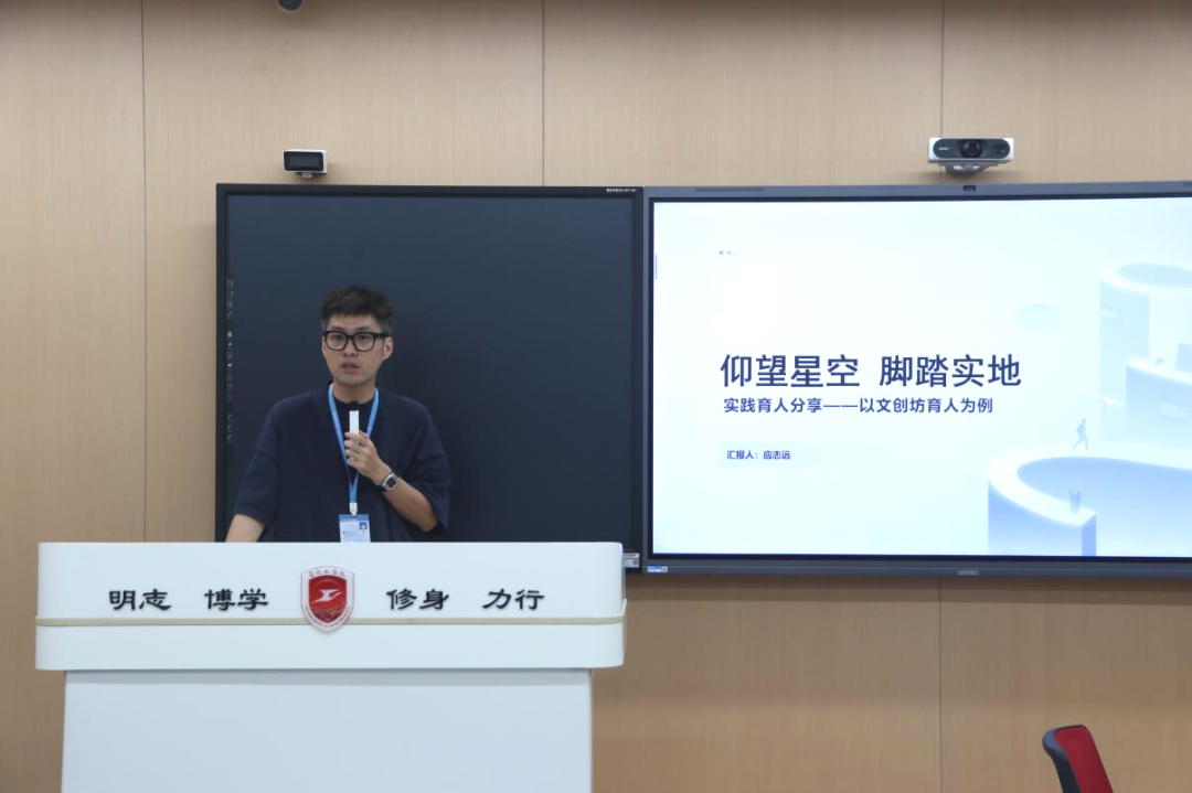 教师进修学院应志远院长分享实践育人经验。他以文创坊的发展历程为鲜活案例,回溯了十余年间带领团队从最初几人组成的小项目组,逐步发展为兼具教学实践、产业服务与文化传播功能的综合育人平台的奋斗轨迹。