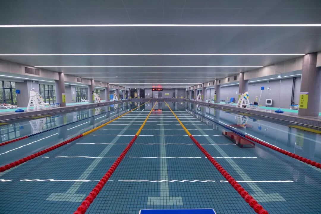 这一切的教学与活动,离不开游泳馆现代化与人性化的设施支持。馆内50米标准泳池、8条清晰泳道、四季恒温的池水,为学生提供了舒适稳定的训练环境。安全设计上也毫不松懈:泳池划分“深浅水区”,1至4道为浅水区,水深1.3米;5-8道为深水区,采用“两边浅、中间深”的渐变结构,水深区间为1.3米与1.8米,周边铺设防滑地垫与安全标识。更衣室、淋浴间、休息区等功能分区合理,热水供应、监控显示屏等细节处处体现着对师生体验的用心。