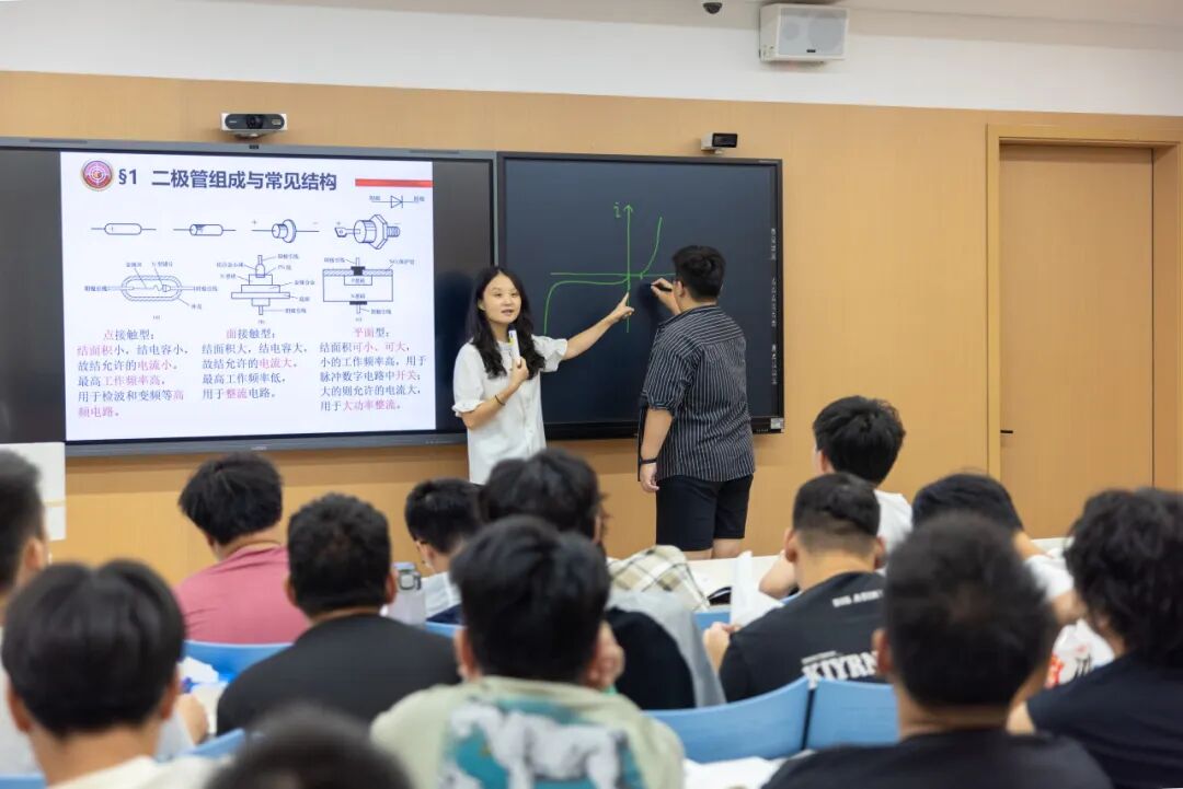 “温度升高时,二极管伏安特性曲线会怎么变化?我们请一位同学上黑板画一下。”在覃杰莉老师的模拟电工技术基础课堂上,频频出现的互动问答引人瞩目。当知识点密度高、节奏快的工科课堂,遇上容易困倦的“早八”节点,如何让学生保持专注力和学习兴趣?充分调和趣味性与知识浓度的互动式课堂就是覃杰莉老师的答案。
